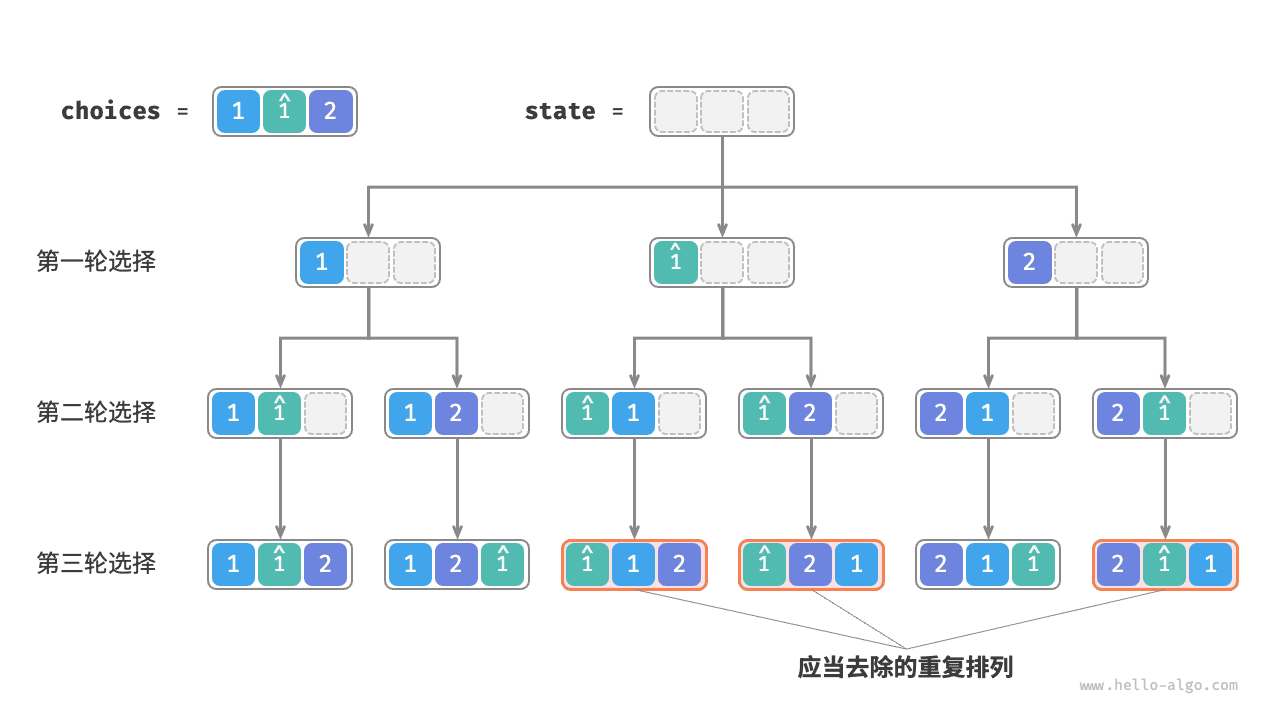 那么如何去除重复的排列呢?最直接地,考虑借助一个哈希集合,直接对排列结果进行去重。然而这样做不够优雅,因为生成重复排列的搜索分支没有必要,应当提前识别并剪枝,这样可以进一步提升算法效率。