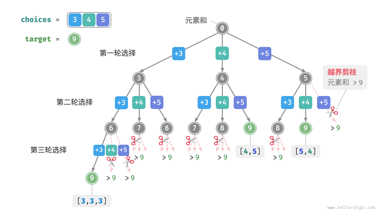 例如,输入集合 \(\{3, 4, 5\}\) 和目标整数 \(9\) ,解为 \(\{3, 3, 3\}, \{4, 5\}\) 。需要注意以下两点。