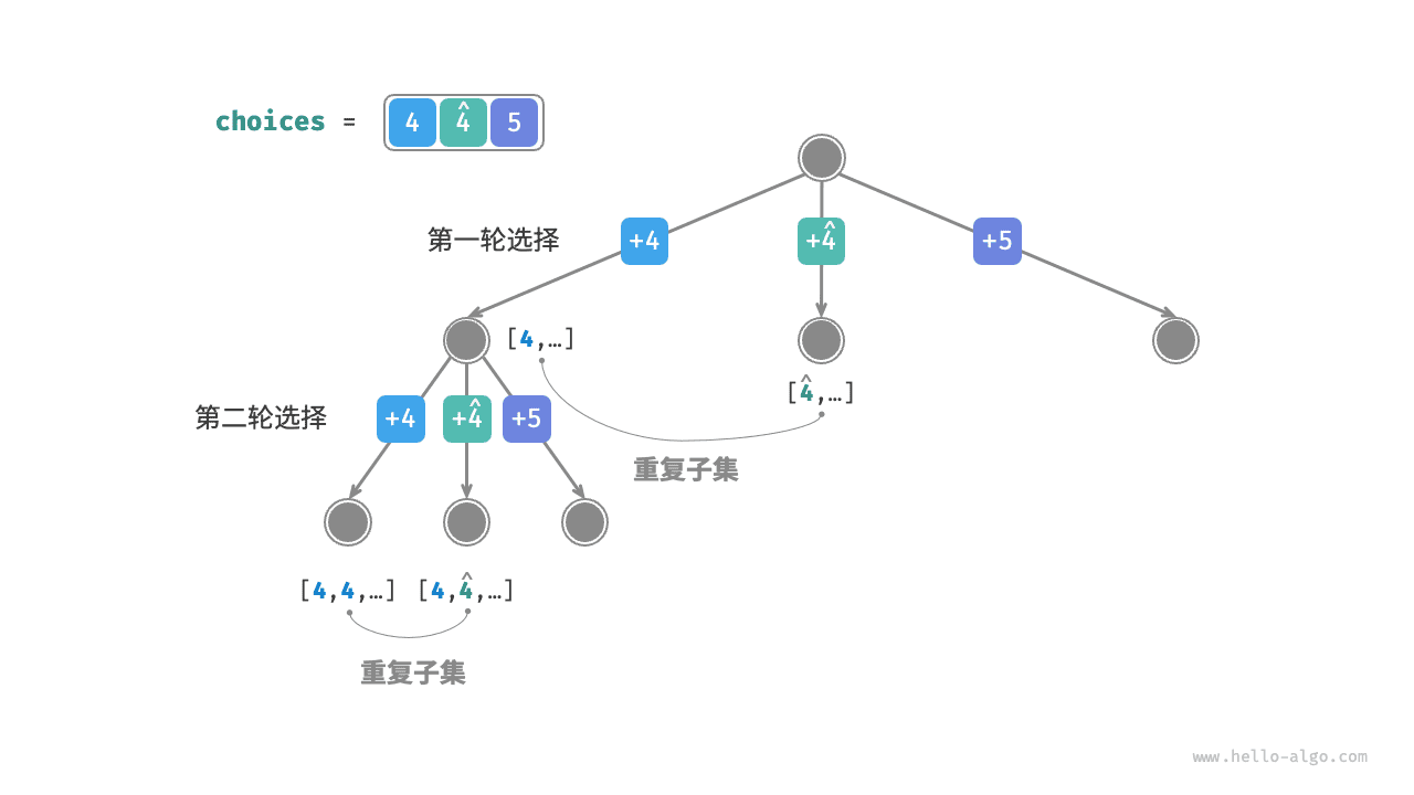相比于上题,本题的输入数组可能包含重复元素,这引入了新的问题。例如,给定数组 \([4, \hat{4}, 5]\) 和目标元素 \(9\) ,则现有代码的输出结果为 \([4, 5], [\hat{4}, 5]\) ,出现了重复子集。