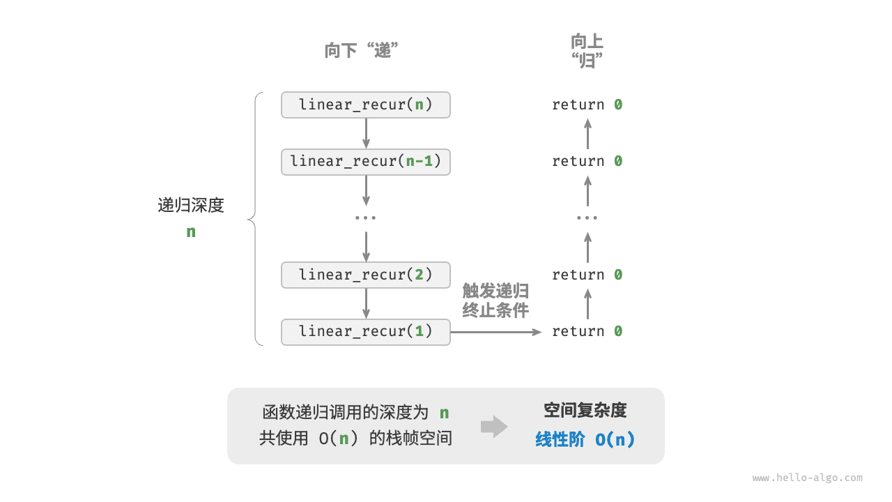 如图 2-17 所示,此函数的递归深度为 \(n\) ,即同时存在 \(n\) 个未返回的 linear_recur() 函数,使用 \(O(n)\) 大小的栈帧空间: