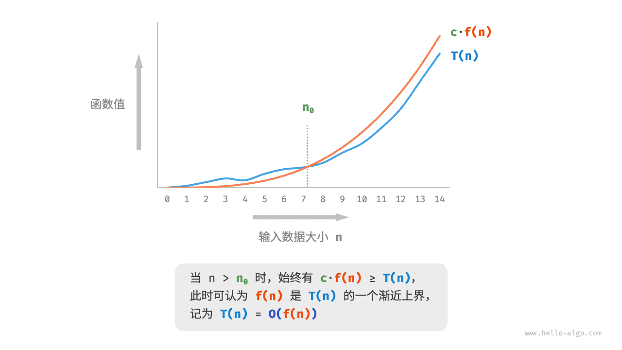 如图 2-8 所示,计算渐近上界就是寻找一个函数 \(f(n)\) ,使得当 \(n\) 趋向于无穷大时,\(T(n)\) 和 \(f(n)\) 处于相同的增长级别,仅相差一个常数系数 \(c\)。