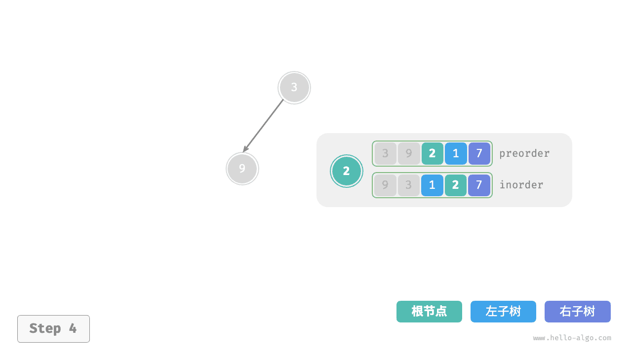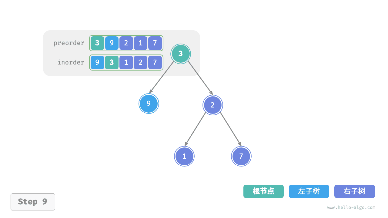 inorder的划分结果,易得左子树和右子树的节点数量分别为 1 和 3 ,从而可将preorder划分为[ 3 | 9 | 2 1 7 ]。