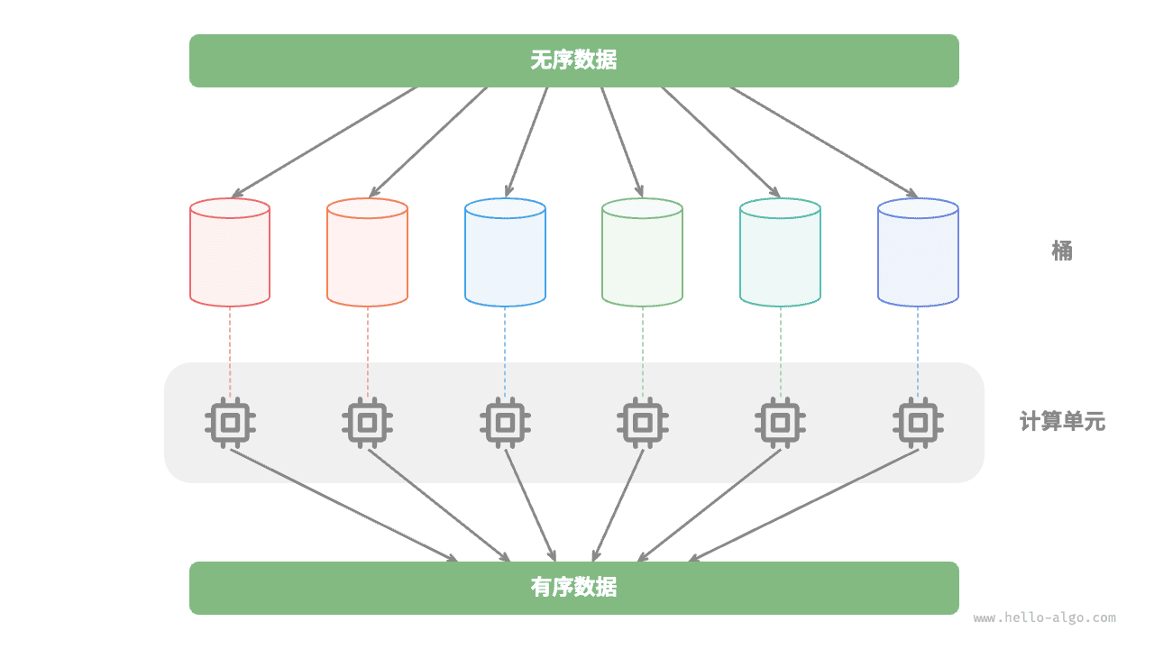 比如在图 12-3 所示的“桶排序”中,我们将海量的数据平均分配到各个桶中,则可将所有桶的排序任务分散到各个计算单元,完成后再合并结果。