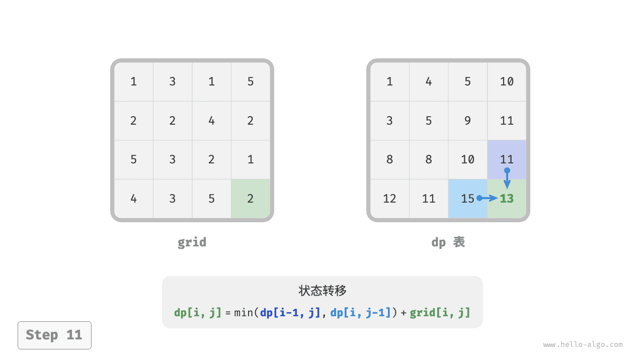 图 14-10 展示了一个例子,给定网格的最小路径和为 \(13\) 。