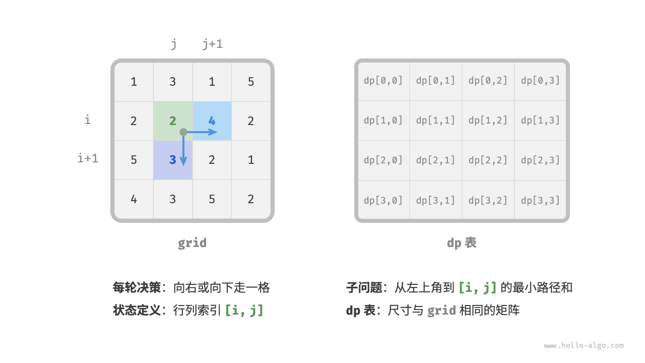 本题的每一轮的决策就是从当前格子向下或向右走一步。设当前格子的行列索引为 \([i, j]\) ,则向下或向右走一步后,索引变为 \([i+1, j]\) 或 \([i, j+1]\) 。因此,状态应包含行索引和列索引两个变量,记为 \([i, j]\) 。