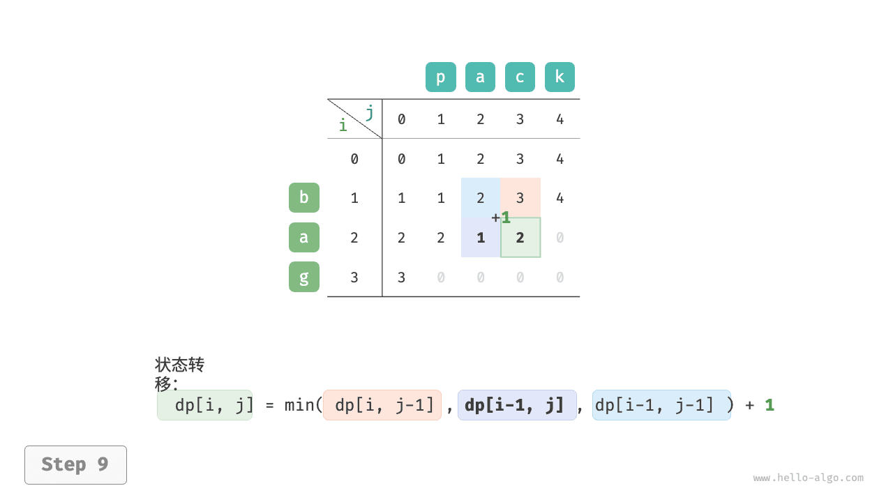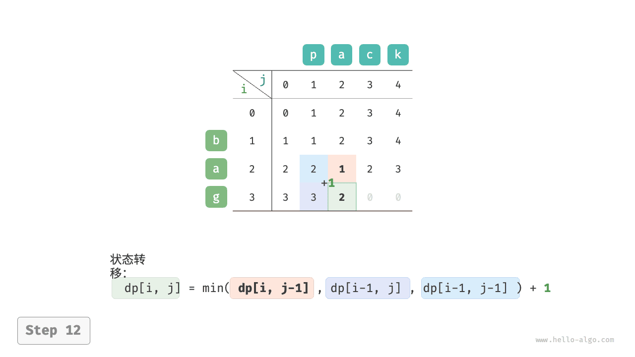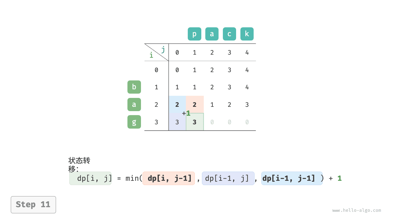 根据以上分析,可得最优子结构:\(dp[i, j]\) 的最少编辑步数等于 \(dp[i, j-1]\)、\(dp[i-1, j]\)、\(dp[i-1, j-1]\) 三者中的最少编辑步数,再加上本次的编辑步数 \(1\) 。对应的状态转移方程为: