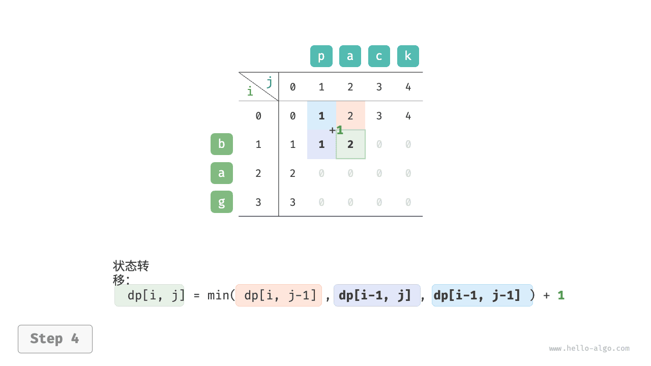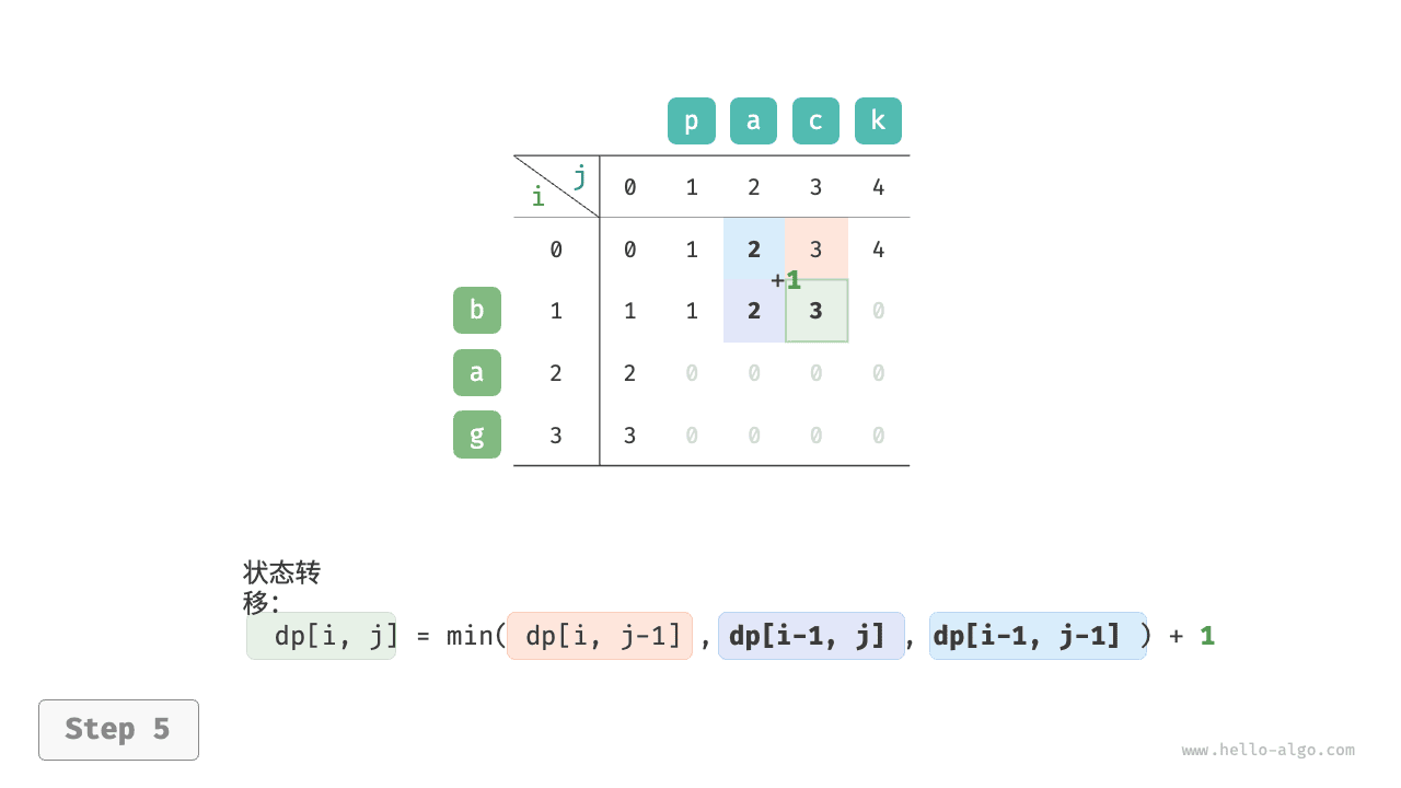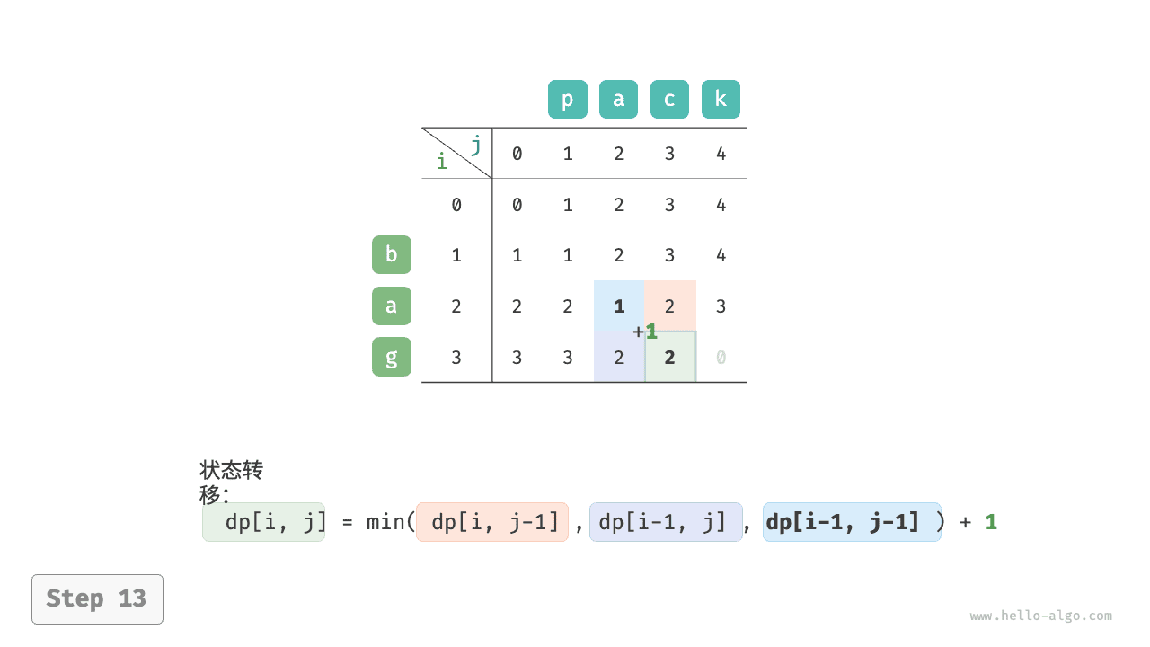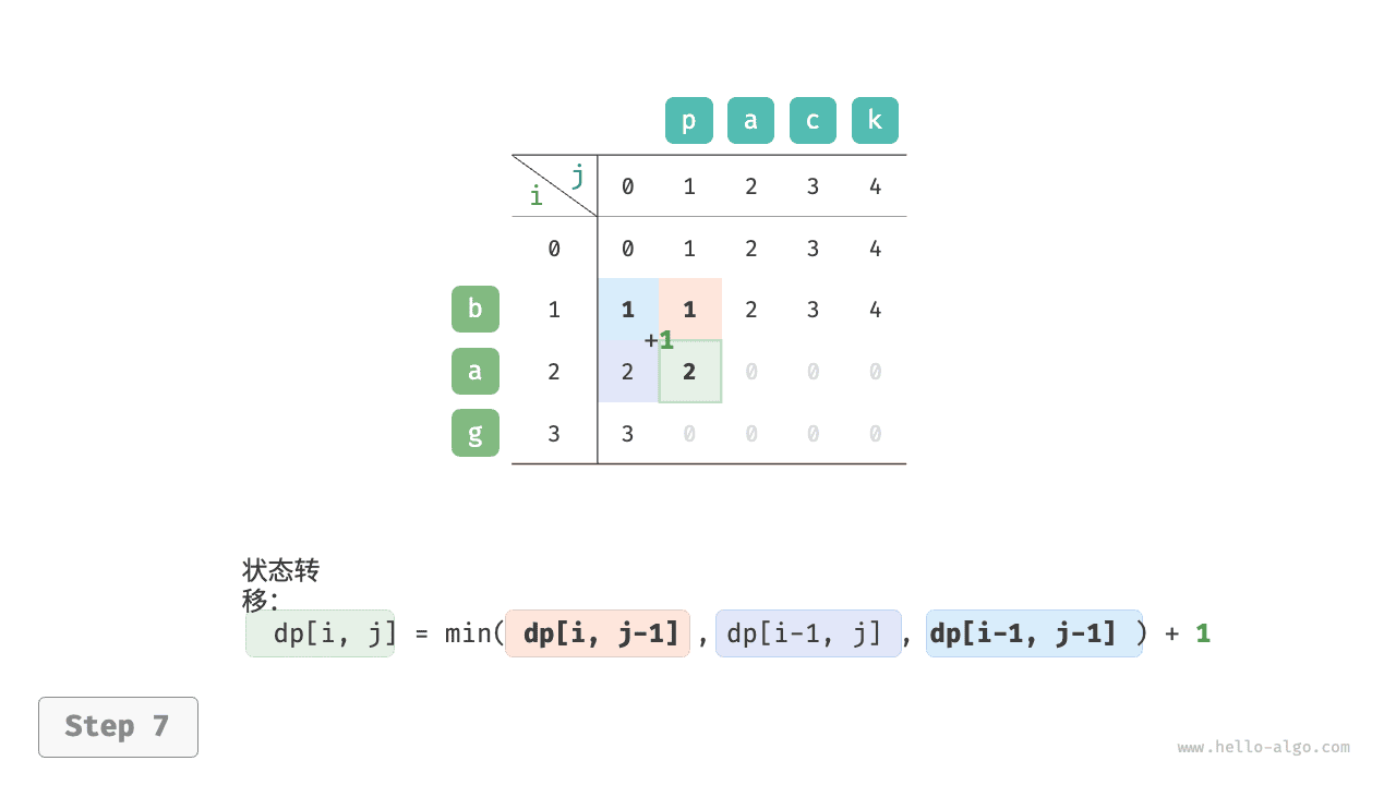 根据以上分析,可得最优子结构:\(dp[i, j]\) 的最少编辑步数等于 \(dp[i, j-1]\)、\(dp[i-1, j]\)、\(dp[i-1, j-1]\) 三者中的最少编辑步数,再加上本次的编辑步数 \(1\) 。对应的状态转移方程为: