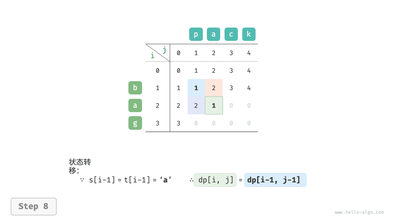 请注意,当 \(s[i-1]\) 和 \(t[j-1]\) 相同时,无须编辑当前字符,这种情况下的状态转移方程为: