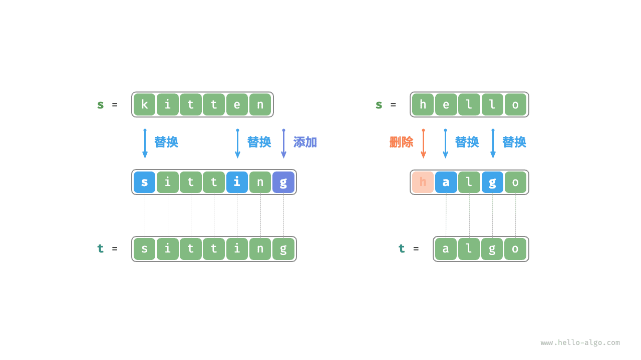 如图 14-27 所示,将 kitten 转换为 sitting 需要编辑 3 步,包括 2 次替换操作与 1 次添加操作;将 hello 转换为 algo 需要 3 步,包括 2 次替换操作和 1 次删除操作。