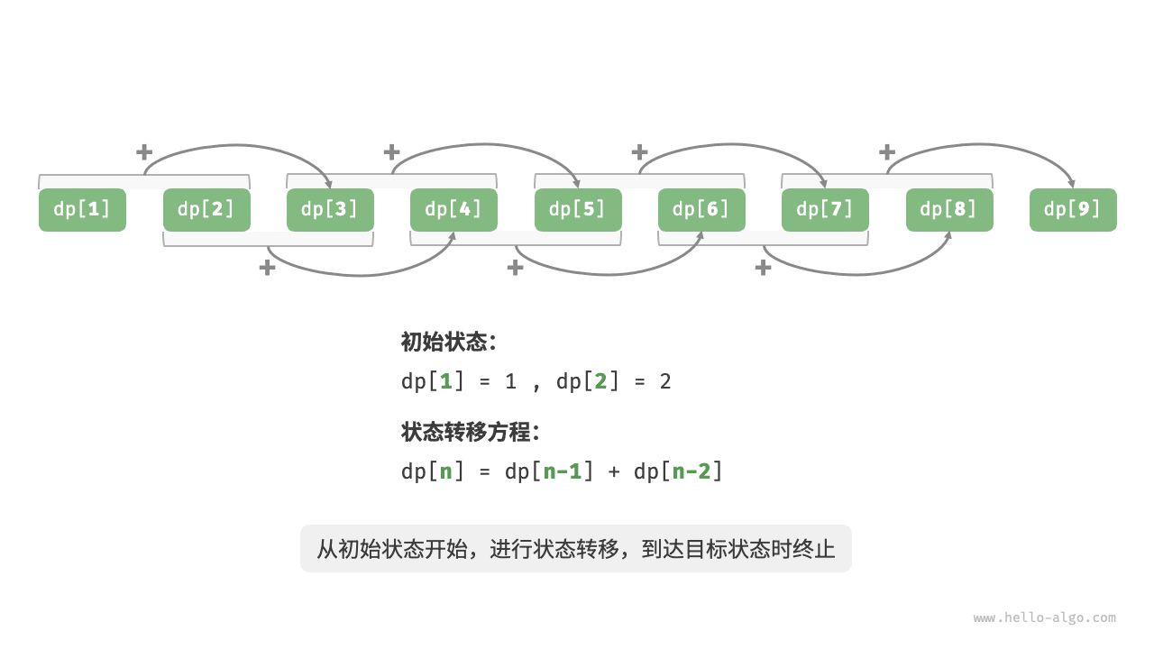 - 将递推公式 \(dp[i] = dp[i-1] + dp[i-2]\) 称为状态转移方程。