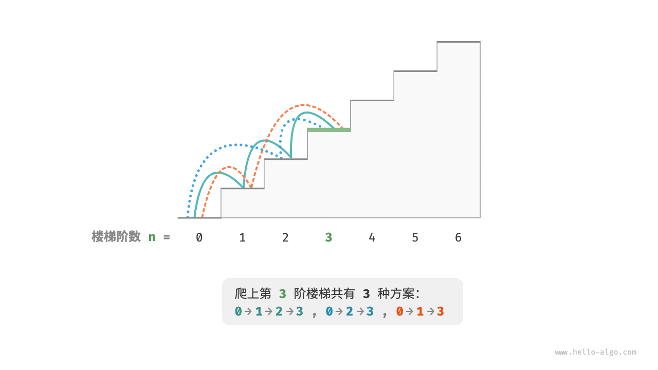 如图 14-1 所示,对于一个 \(3\) 阶楼梯,共有 \(3\) 种方案可以爬到楼顶。