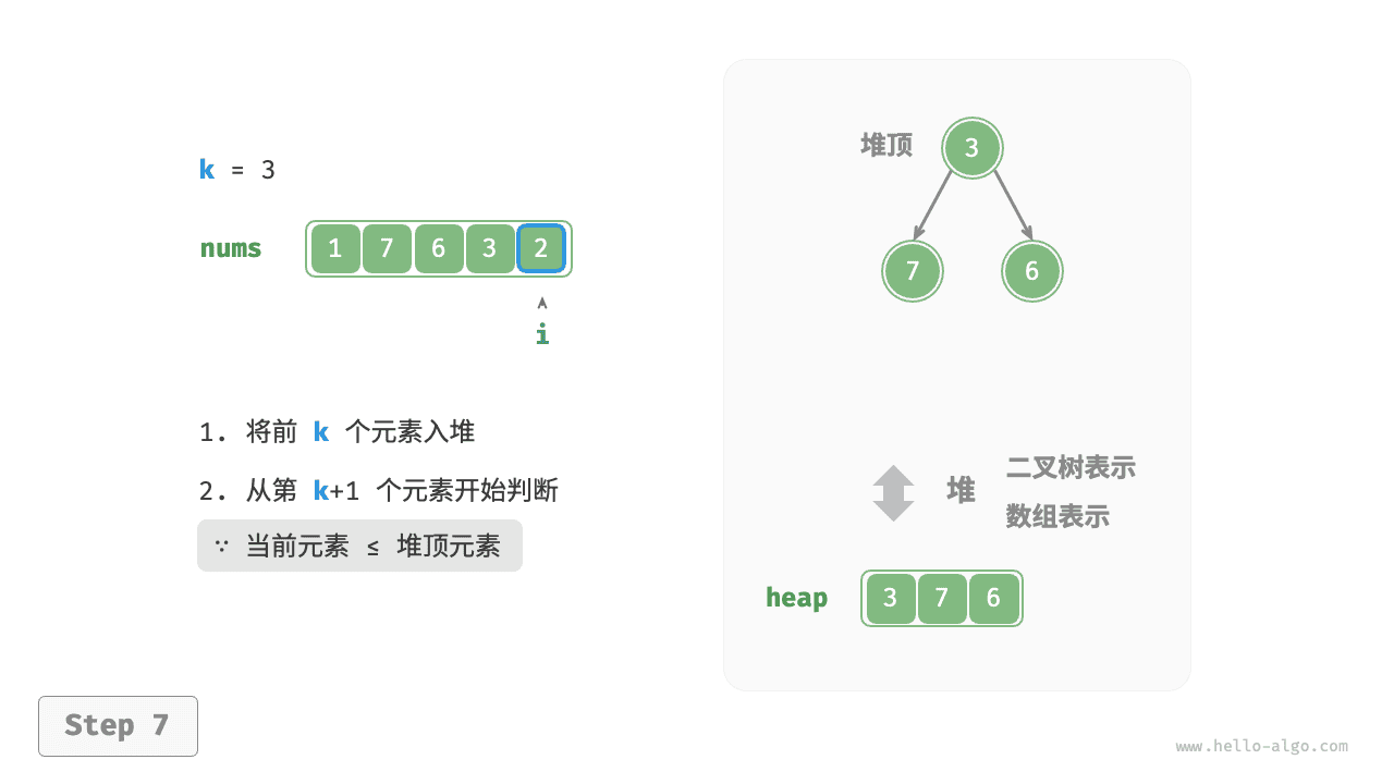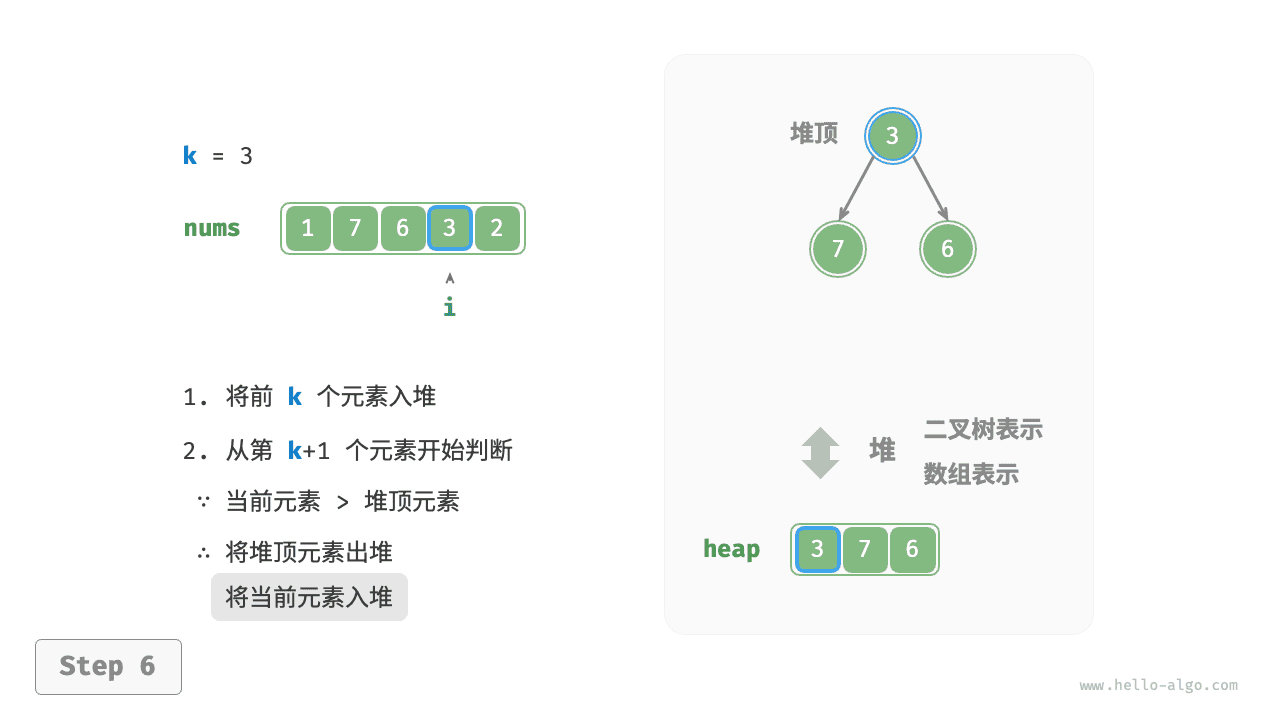 - 从第 \(k + 1\) 个元素开始,若当前元素大于堆顶元素,则将堆顶元素出堆,并将当前元素入堆。