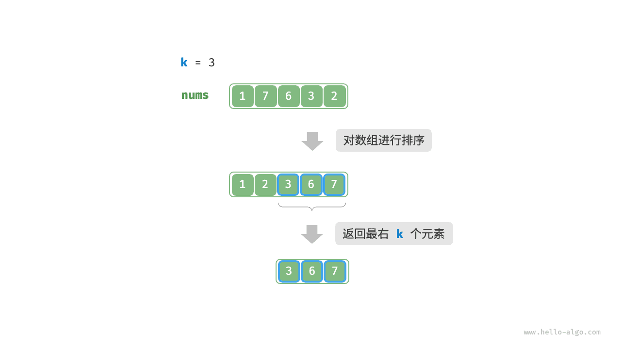 如图 8-7 所示,我们可以先对数组 nums 进行排序,再返回最右边的 \(k\) 个元素,时间复杂度为 \(O(n \log n)\) 。