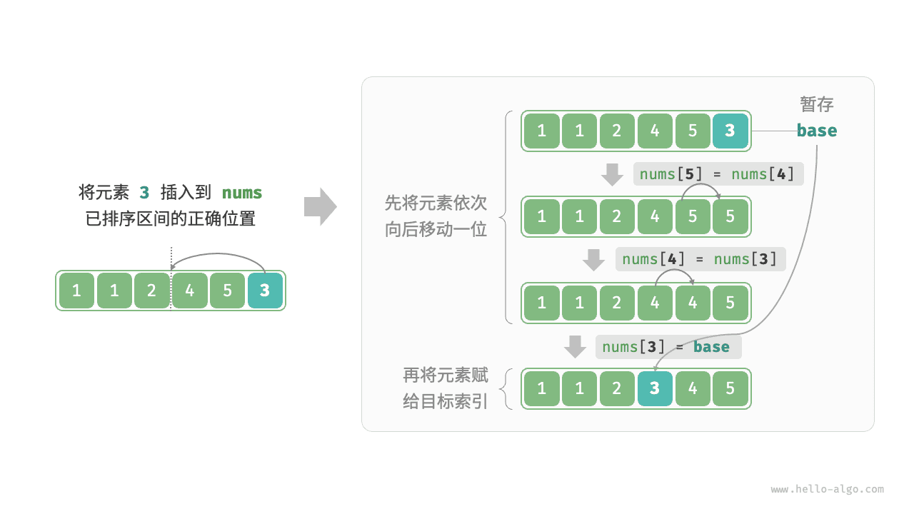 图 11-6 展示了数组插入元素的操作流程。设基准元素为 base ,我们需要将从目标索引到 base 之间的所有元素向右移动一位,然后将 base 赋值给目标索引。