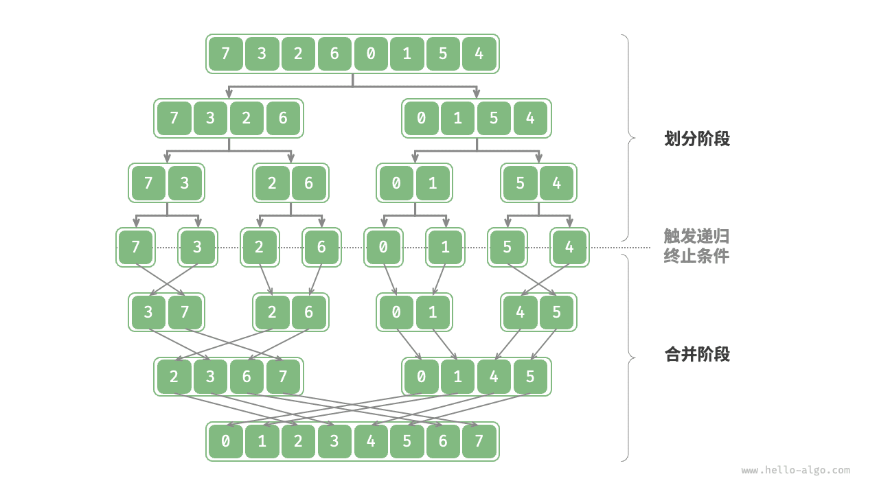 - 时间复杂度为 \(O(n \log n)\)、非自适应排序:划分产生高度为 \(\log n\) 的递归树,每层合并的总操作数量为 \(n\) ,因此总体时间复杂度为 \(O(n \log n)\) 。