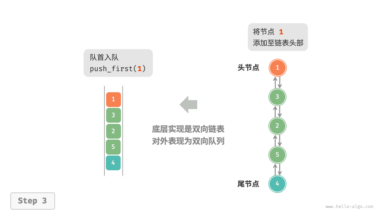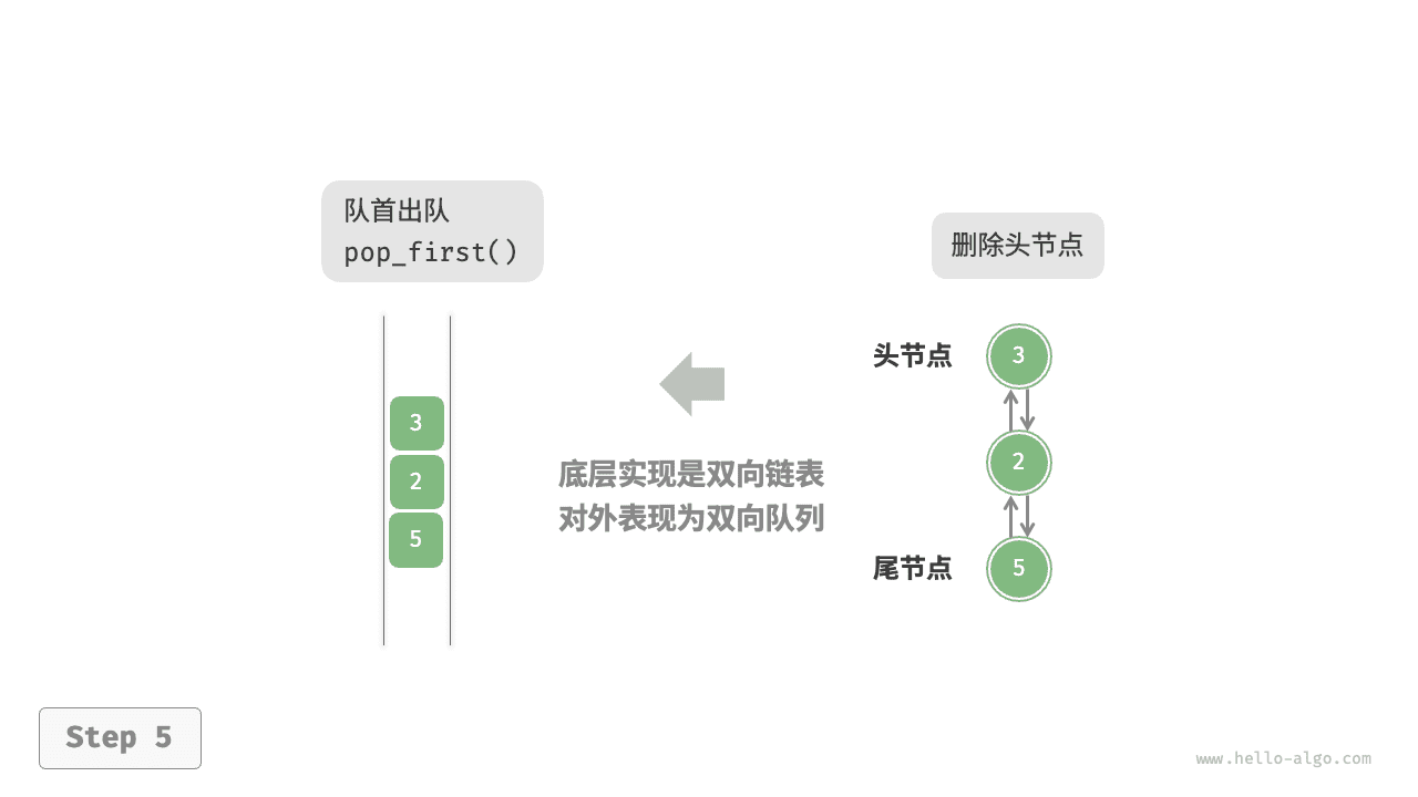 在队列中,我们仅能删除头部元素或在尾部添加元素。如图 5-7 所示,双向队列(double-ended queue)提供了更高的灵活性,允许在头部和尾部执行元素的添加或删除操作。