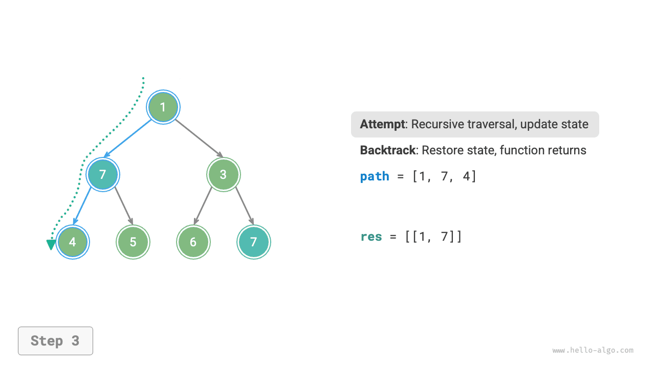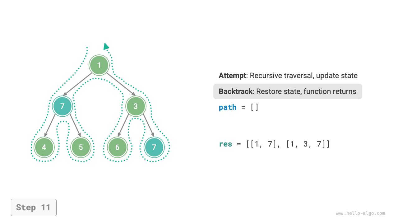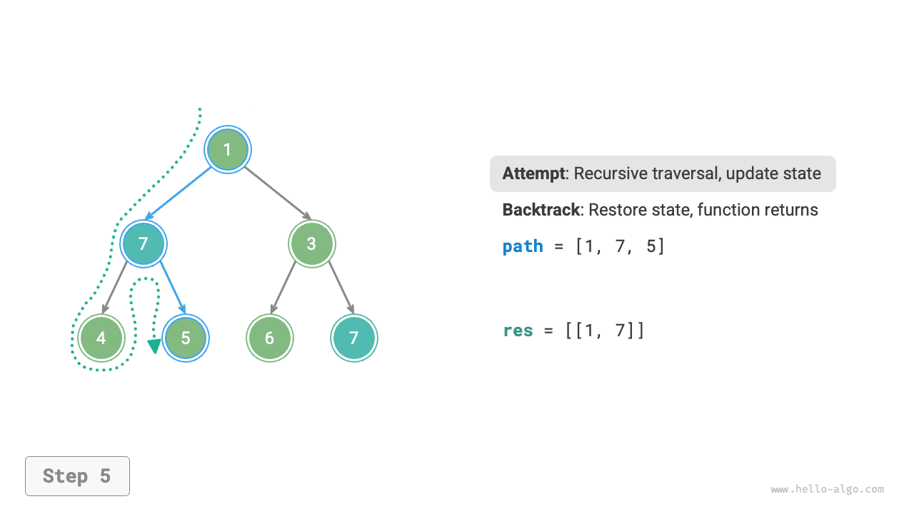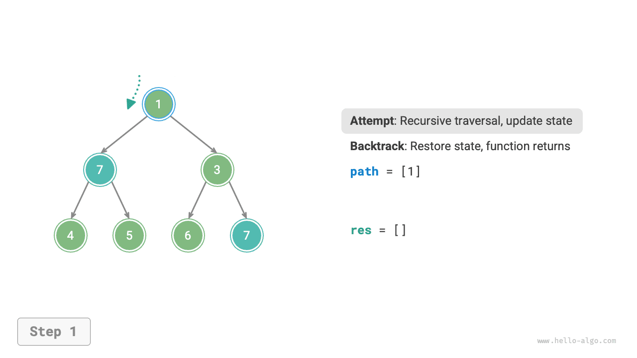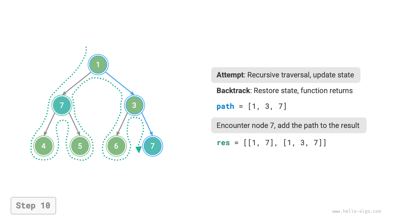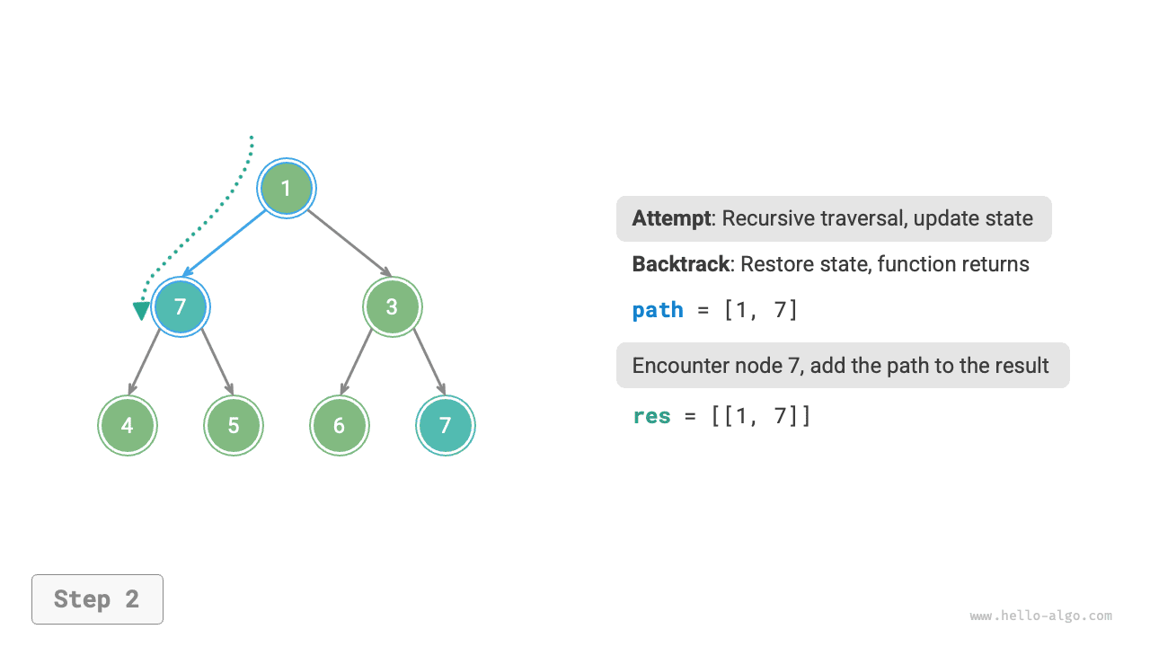 | Attempt (attempt) | An attempt is the process of exploring the solution space according to available choices, including making choices, updating state, and checking if it is a solution | Recursively visit left (right) child nodes, add nodes to path, check if node value is \(7\) |
