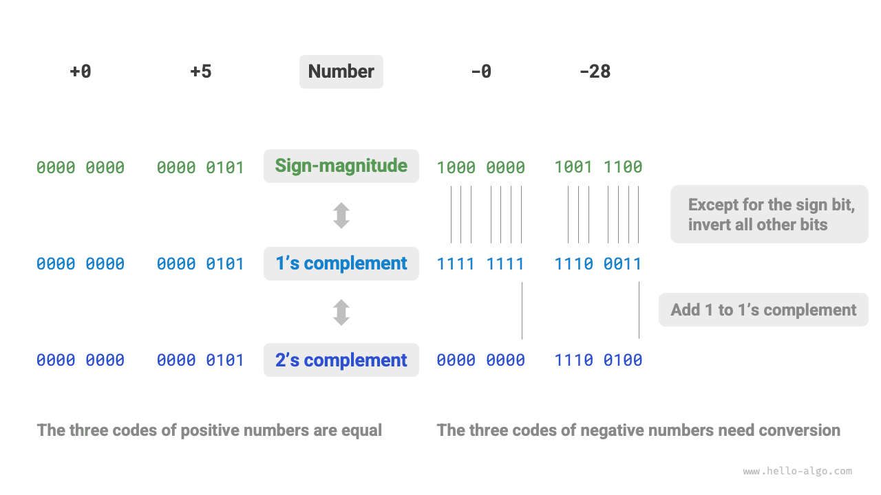 - Sign-magnitude: We treat the highest bit of the binary representation of a number as the sign bit, where \(0\) represents a positive number and \(1\) represents a negative number, and the remaining bits represent the value of the number.