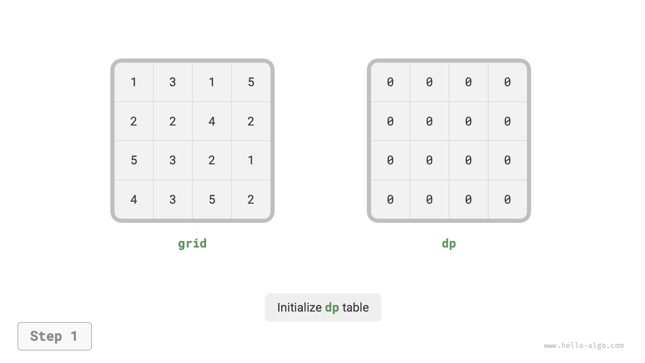 From this, we obtain the two-dimensional \(dp\) matrix shown in Figure 14-11, whose size is the same as the input grid \(grid\).