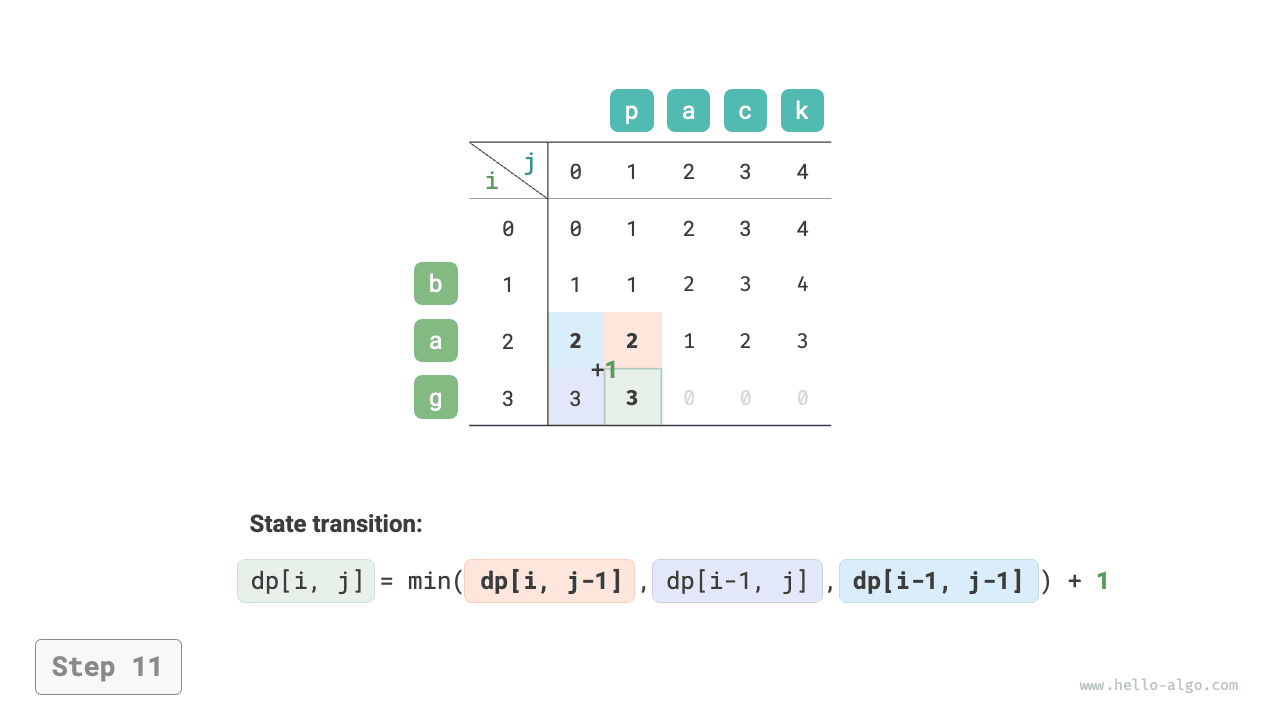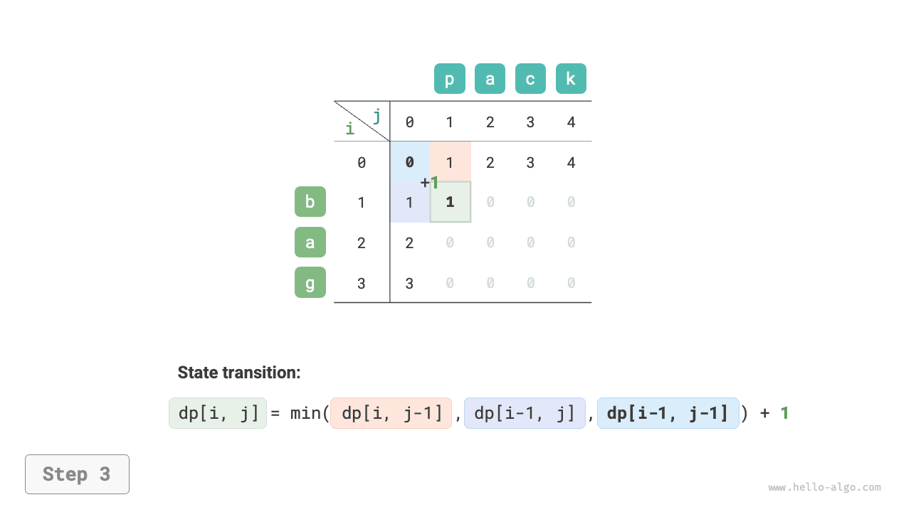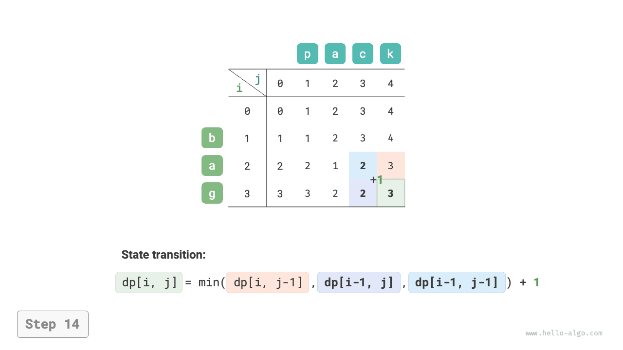 Based on the above analysis, the optimal substructure can be obtained: the minimum number of edits for \(dp[i, j]\) equals the minimum among the minimum edit steps of \(dp[i, j-1]\), \(dp[i-1, j]\), and \(dp[i-1, j-1]\), plus the edit step \(1\) for this time. The corresponding state transition equation is: