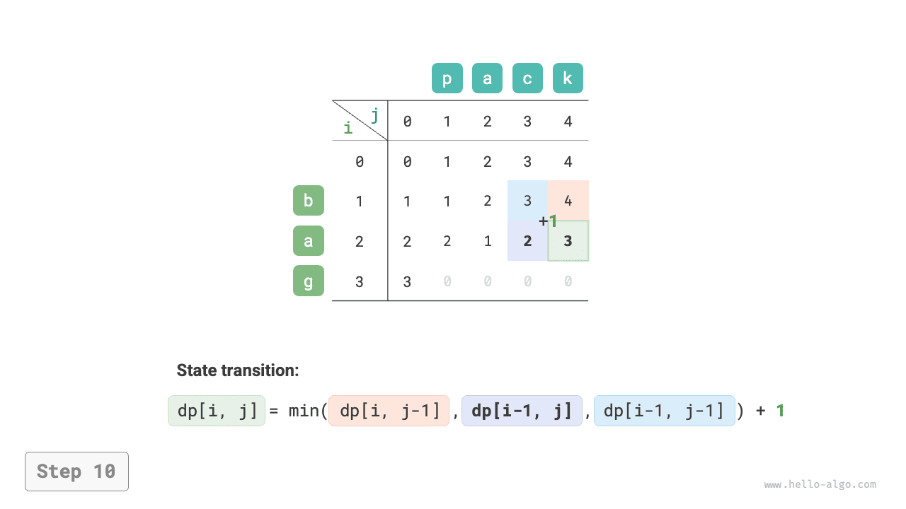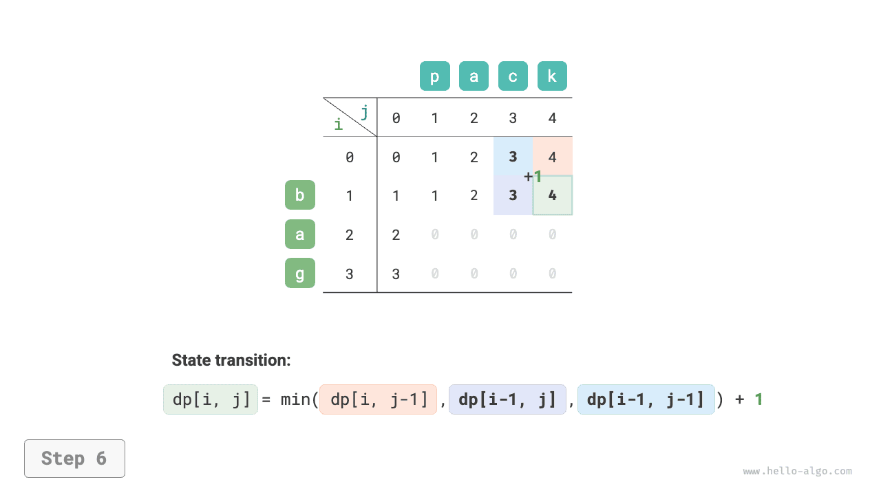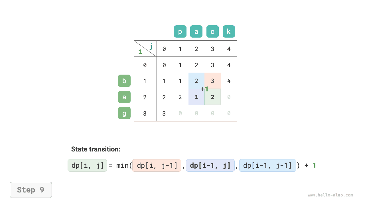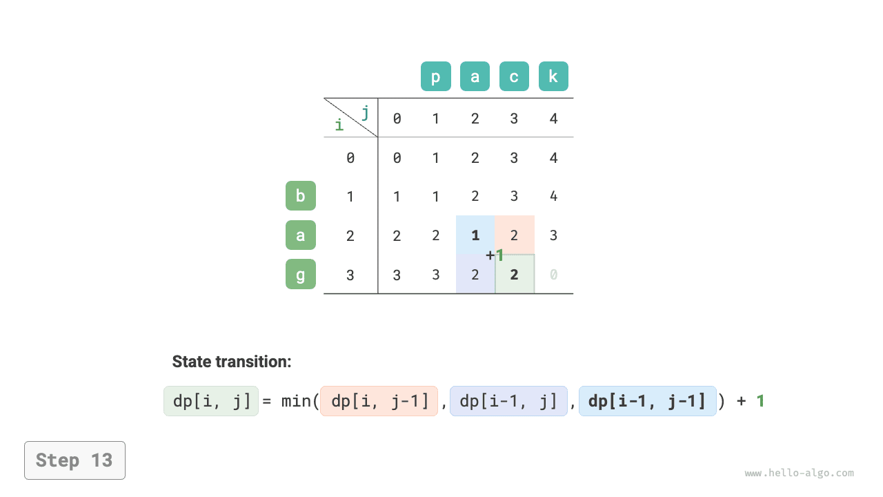 Based on the above analysis, the optimal substructure can be obtained: the minimum number of edits for \(dp[i, j]\) equals the minimum among the minimum edit steps of \(dp[i, j-1]\), \(dp[i-1, j]\), and \(dp[i-1, j-1]\), plus the edit step \(1\) for this time. The corresponding state transition equation is: