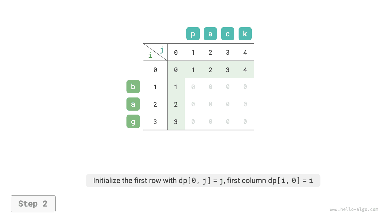When both strings are empty, the number of edit steps is \(0\), i.e., \(dp[0, 0] = 0\). When \(s\) is empty but \(t\) is not, the minimum number of edit steps equals the length of \(t\), i.e., the first row \(dp[0, j] = j\). When \(s\) is not empty but \(t\) is empty, the minimum number of edit steps equals the length of \(s\), i.e., the first column \(dp[i, 0] = i\).