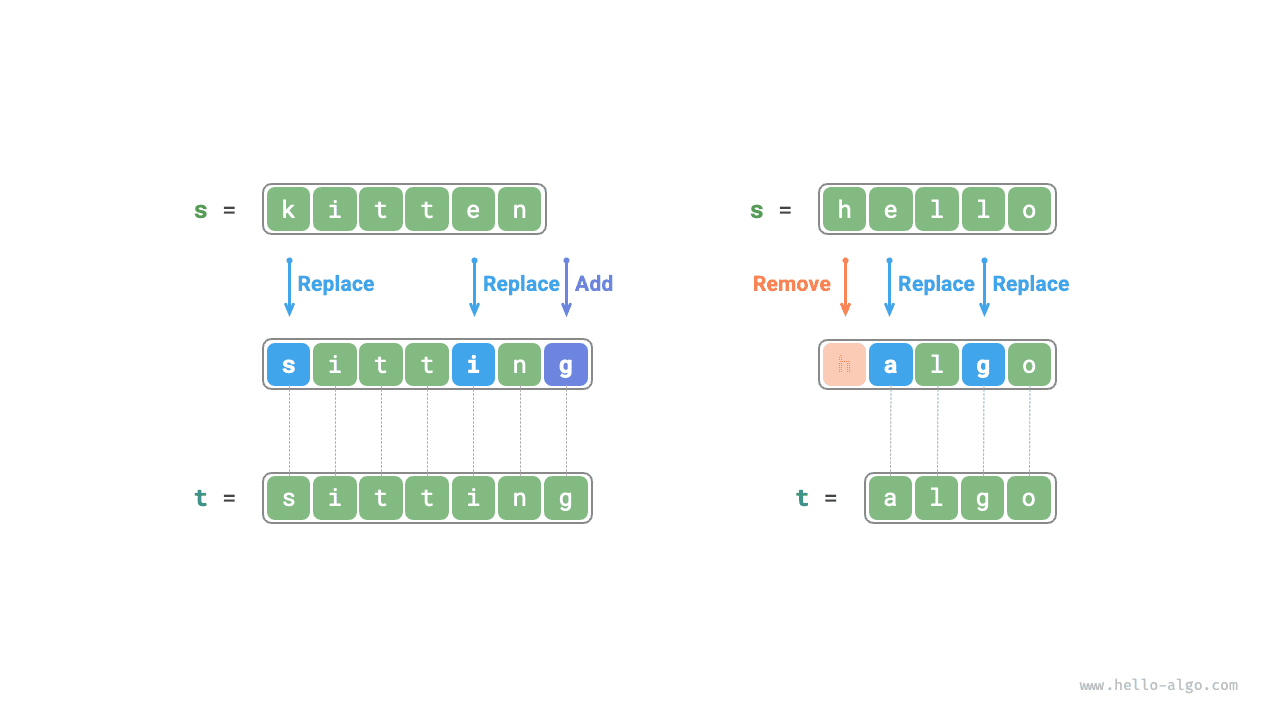 As shown in Figure 14-27, transforming kitten into sitting requires 3 edits, including 2 replacements and 1 insertion; transforming hello into algo requires 3 steps, including 2 replacements and 1 deletion.