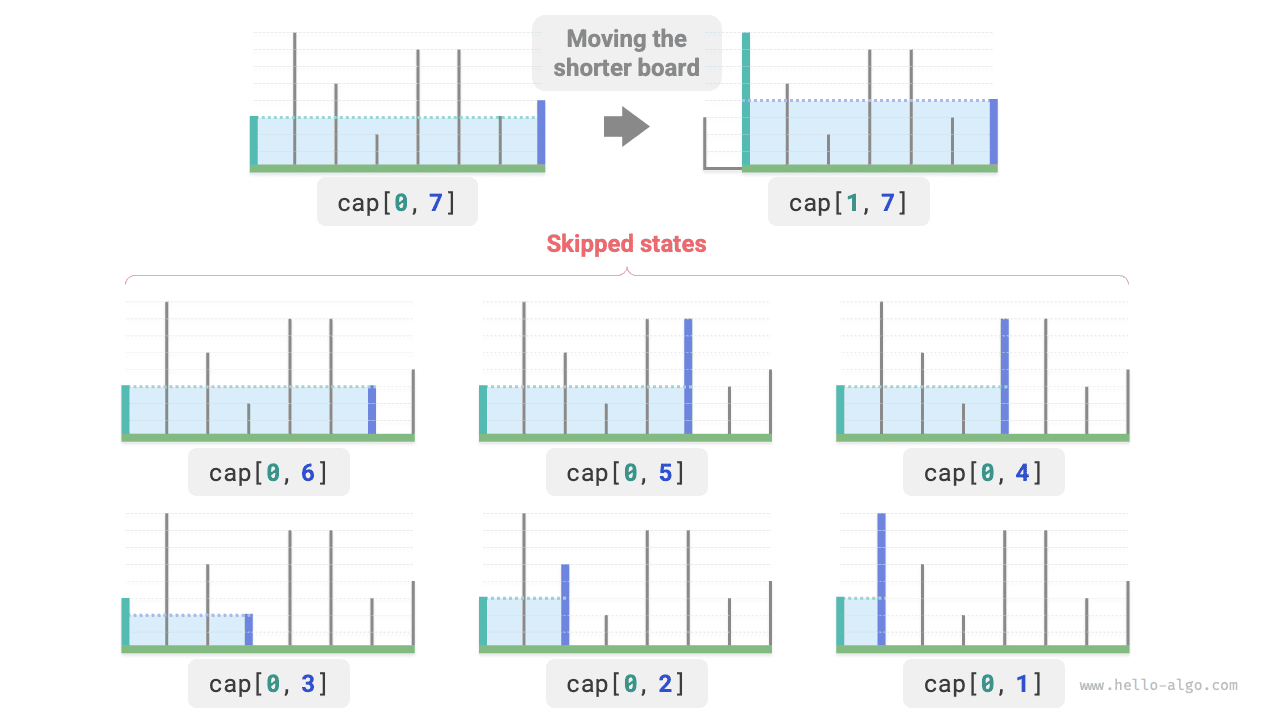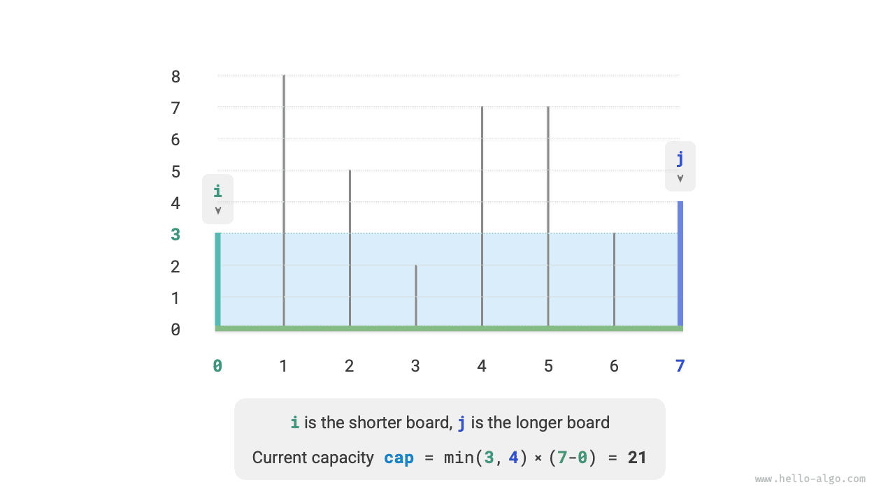 This problem has a more efficient solution. As shown in Figure 15-8, select a state \([i, j]\) where index \(i < j\) and height \(ht[i] < ht[j]\), meaning \(i\) is the short partition and \(j\) is the long partition.