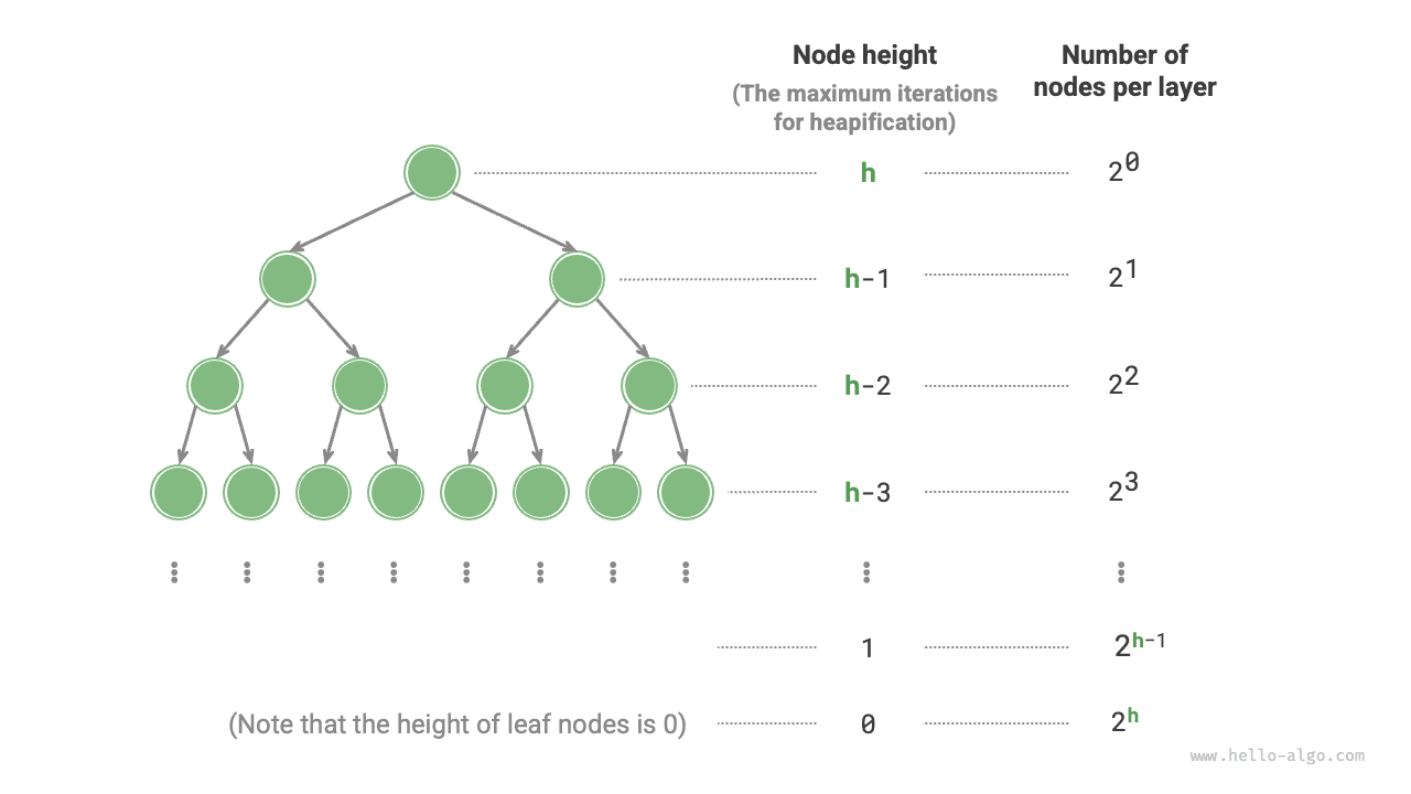 Furthermore, a perfect binary tree with height \(h\) has \(n = 2^{h+1} - 1\) nodes, so the complexity is \(O(2^h) = O(n)\). This derivation shows that the time complexity of building a heap from an input list is \(O(n)\), which is highly efficient.