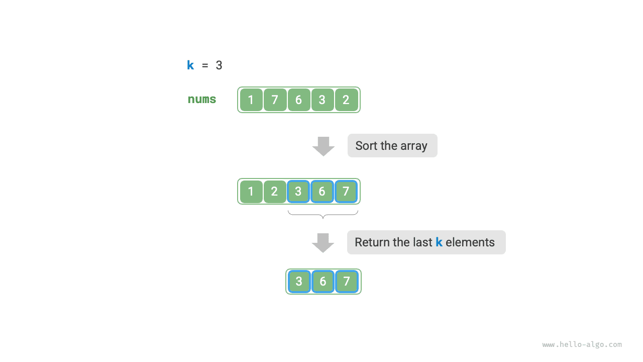 As shown in Figure 8-7, we can first sort the array nums, then return the rightmost \(k\) elements, with a time complexity of \(O(n \log n)\).