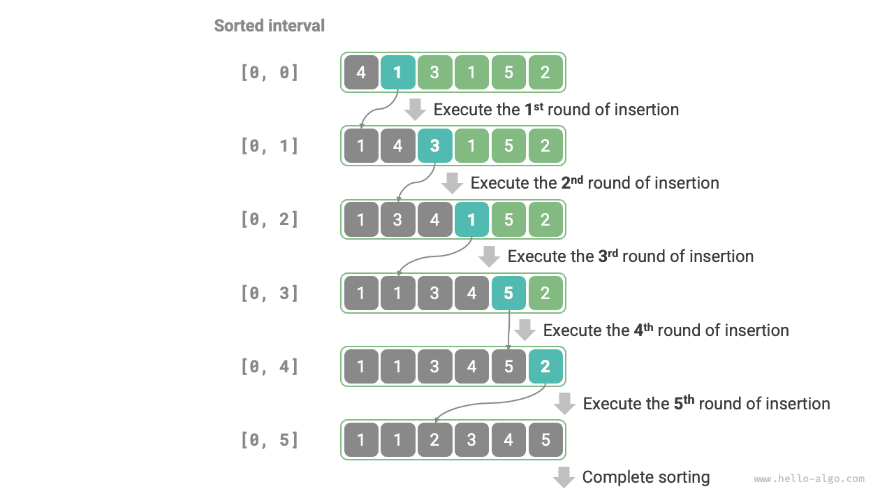 Specifically, we select a base element from the unsorted interval, compare the element with elements in the sorted interval to its left one by one, and insert the element into the correct position.