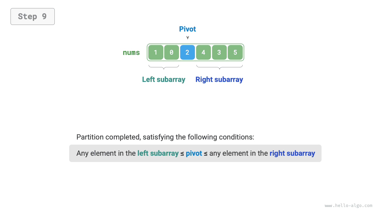 After sentinel partitioning is complete, the original array is divided into three parts: left sub-array, pivot, right sub-array, satisfying "any element in left sub-array \(\leq\) pivot \(\leq\) any element in right sub-array". Therefore, we next only need to sort these two sub-arrays.