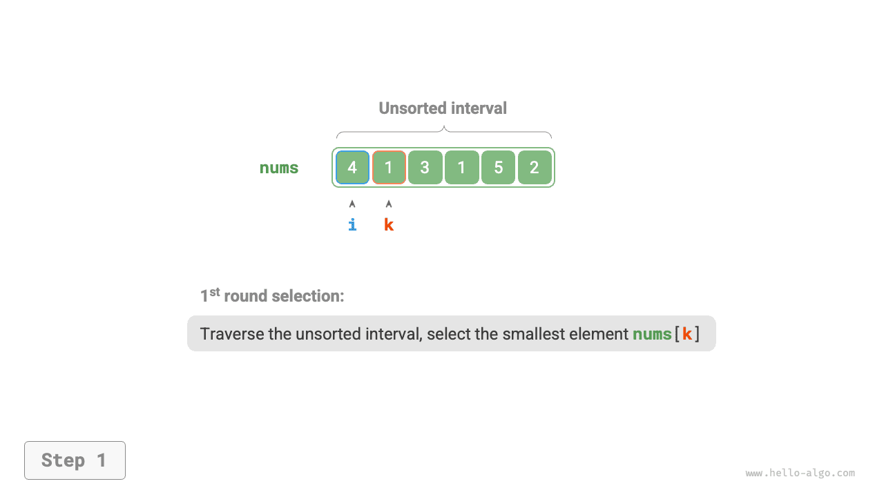 - Select the smallest element in the interval \([1, n-1]\) and swap it with the element at index \(1\). After completion, the first 2 elements of the array are sorted.