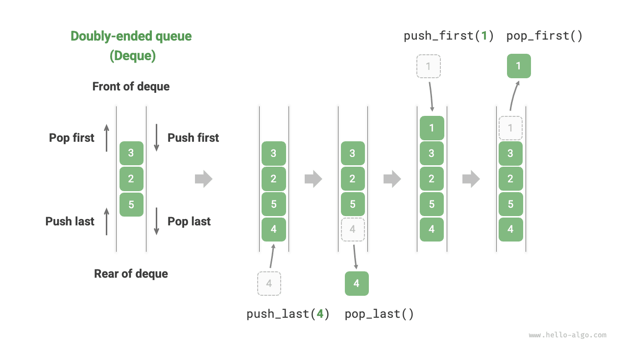 In a queue, we can only remove elements from the front or add elements at the rear. As shown in Figure 5-7, a double-ended queue (deque) provides greater flexibility, allowing the addition or removal of elements at both the front and rear.