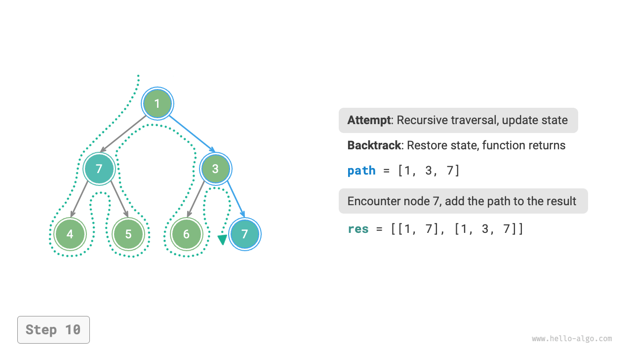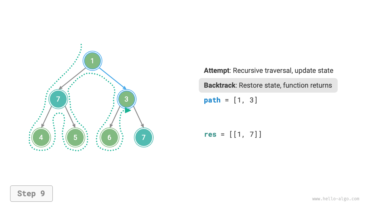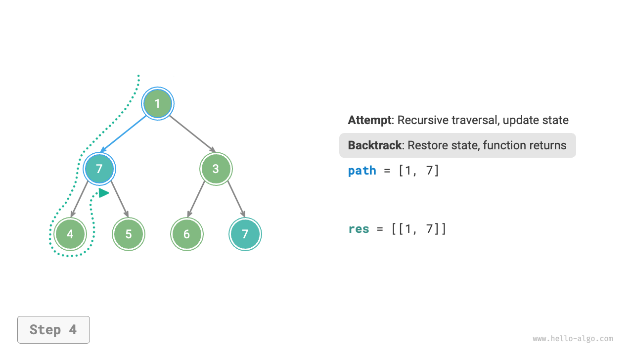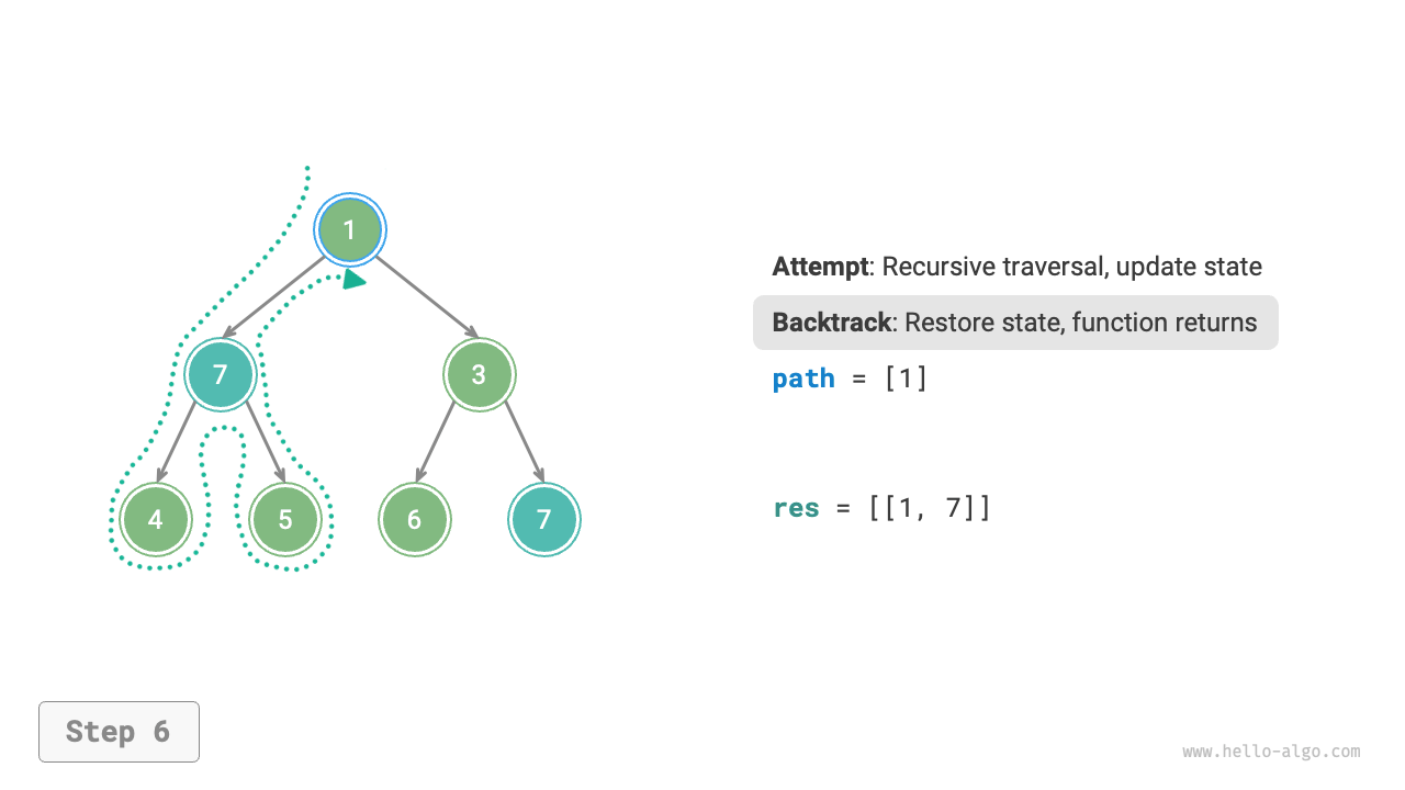 | 試行(attempt) | 試行は、利用可能な選択肢に基づいて解空間を探索する過程であり、選択を行い、状態を更新し、解かどうかを確認する | 左(右)子ノードを再帰的に訪問し、ノードを path に追加し、ノードの値が \(7\) かを確認する |