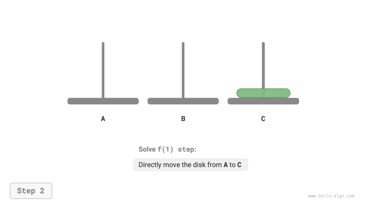 以下の図に示すように、問題 \(f(1)\)(円盤が1枚のみ)については、A から C に直接移動できます。