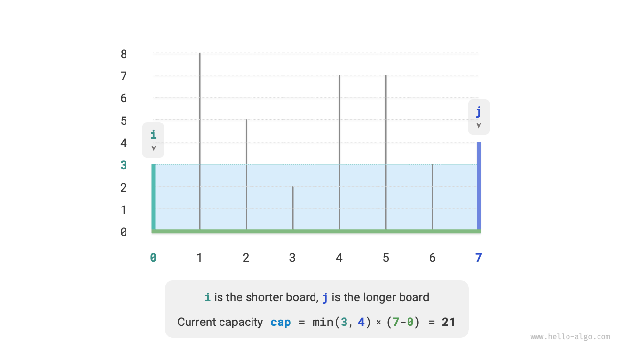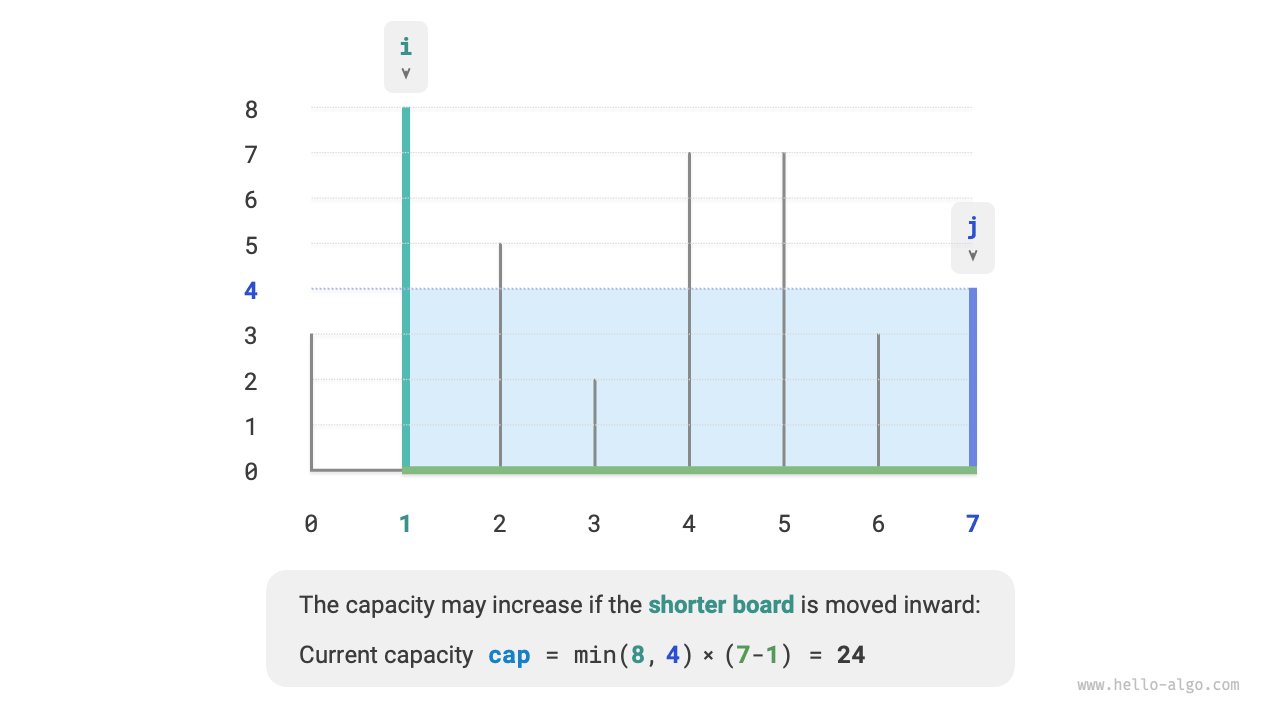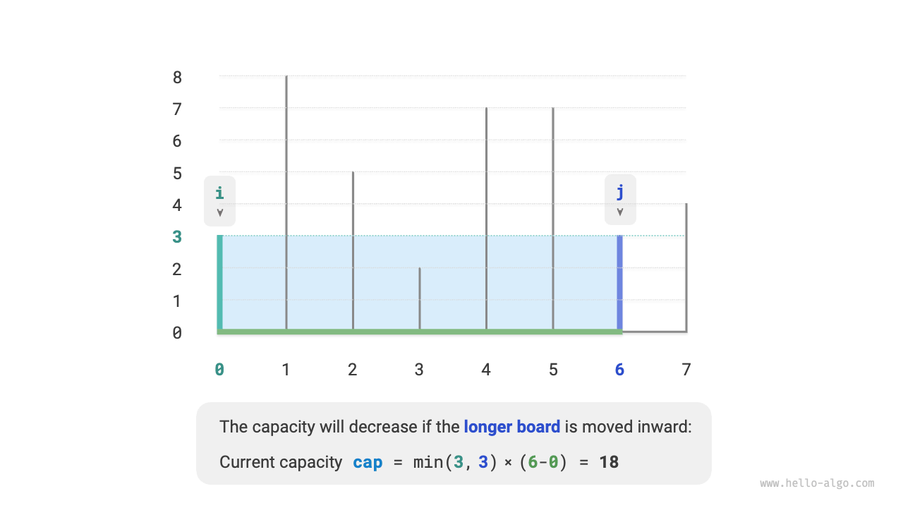 これにより、この問題の貪欲戦略が導かれます:コンテナの両端に2つのポインタを初期化し、各ラウンドで短い仕切りに対応するポインタを内側に移動し、2つのポインタが出会うまで続けます。