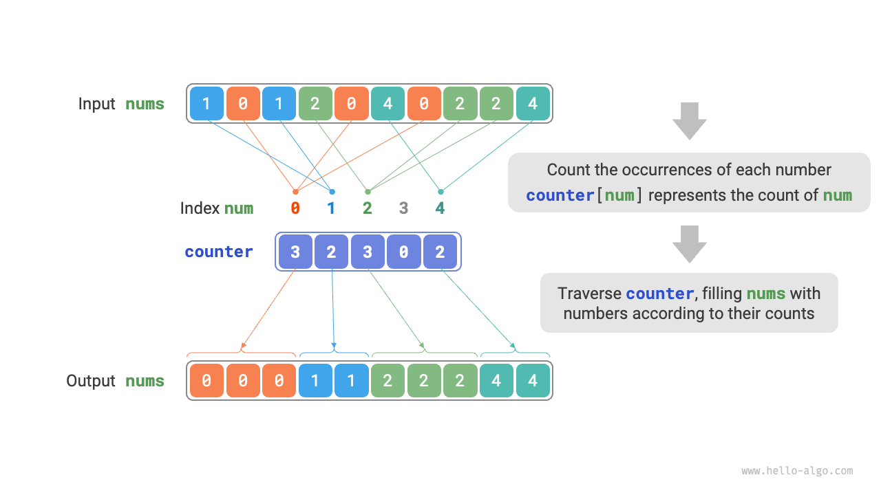 numsとcounterの走査が含まれ、どちらも線形時間を使用します。一般的に、\(n \gg m\) であり、時間計算量は \(O(n)\) に近づきます。 - 空間計算量は \(O(n + m)\)、非インプレースソート:長さ \(n\) の配列