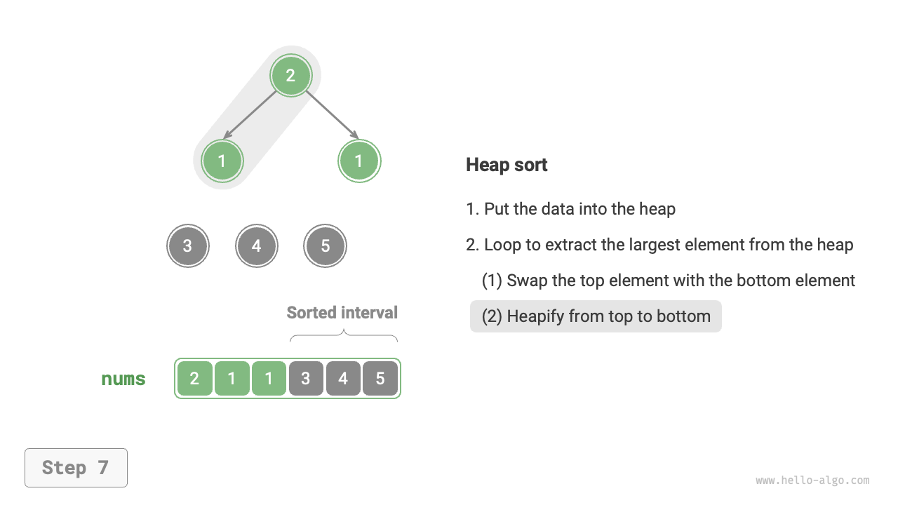 - ヒープの頂上から開始して、上から下へのsift-down操作を実行します。sift-downの後、ヒープの性質が復元されます。