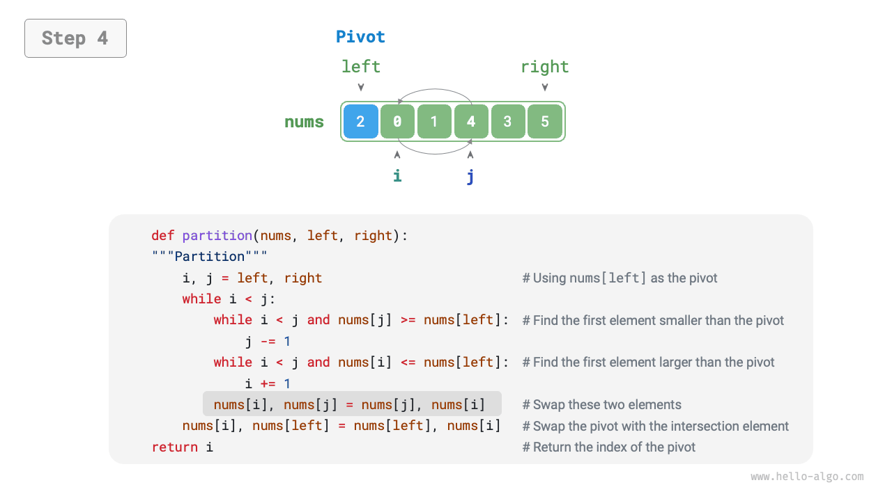 i(j)を使用してピボットより大きい(小さい)最初の要素を探索し、次にこれら2つの要素を交換するループを設定します。 iとjが出会うまでステップ2.を繰り返し、最後にピボットを2つのサブ配列の境界に交換します。