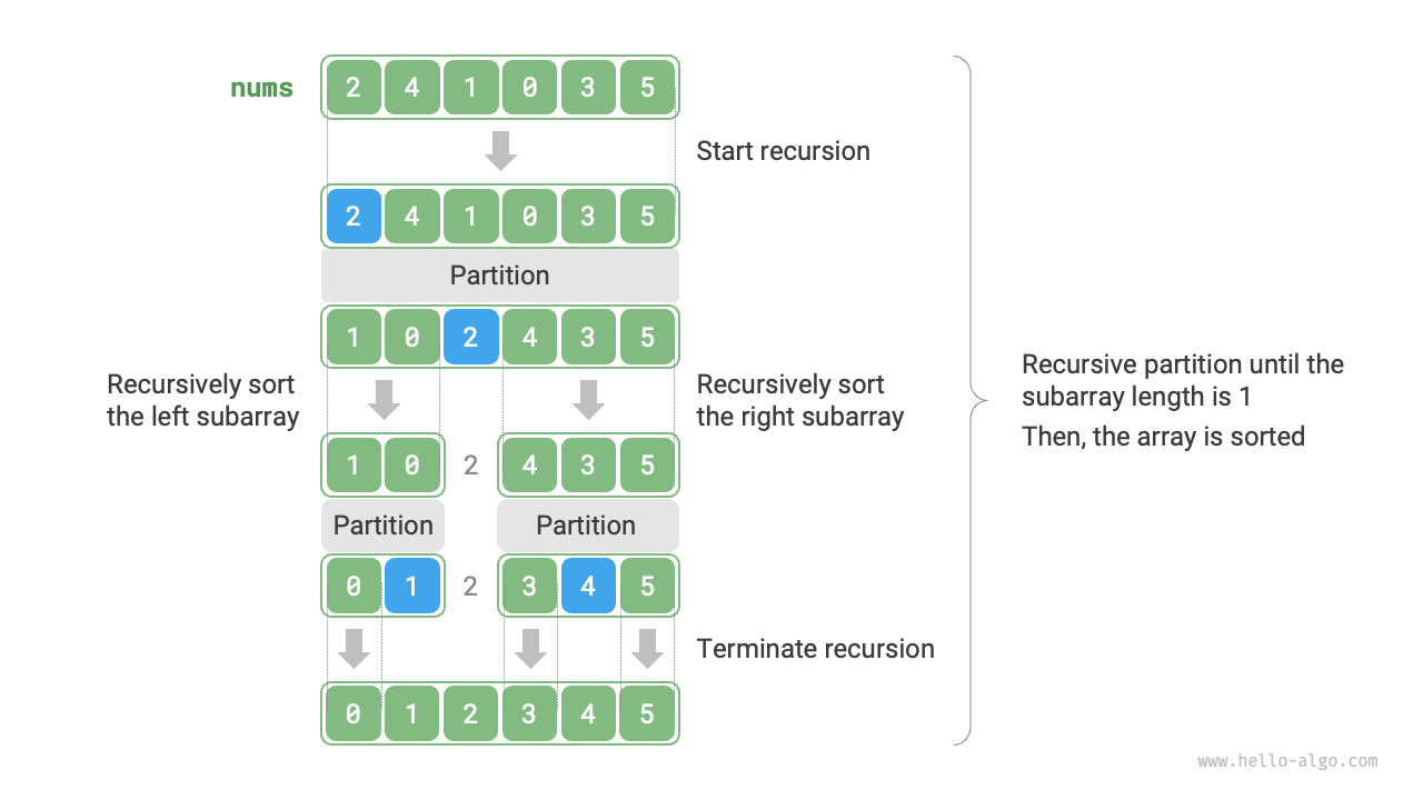 - \(O(n \log n)\)の時間計算量、非適応ソート:平均的なケースでは、ピボット分割の再帰レベルは\(\log n\)で、レベルあたりのループの総数は\(n\)であり、全体で\(O(n \log n)\)の時間を使用します。最悪の場合、各ラウンドのピボット分割は長さ\(n\)の配列を長さ\(0\)と\(n - 1\)の2つのサブ配列に分割し、再帰レベル数が\(n\)に達すると、各レベルのループ数は\(n\)で、使用される総時間は\(O(n^2)\)です。