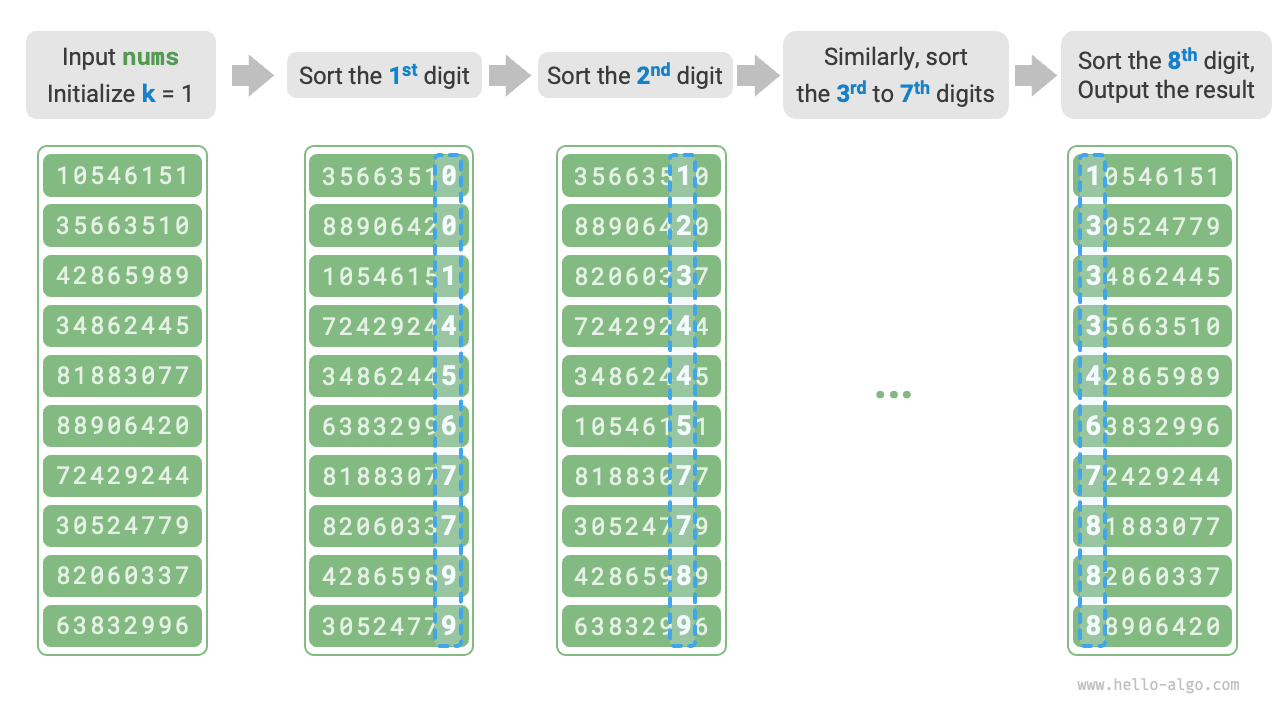 - 学生IDの \(k\) 番目の桁に対して「計数ソート」を実行します。完了後、データは \(k\) 番目の桁に基づいて最小から最大までソートされます。