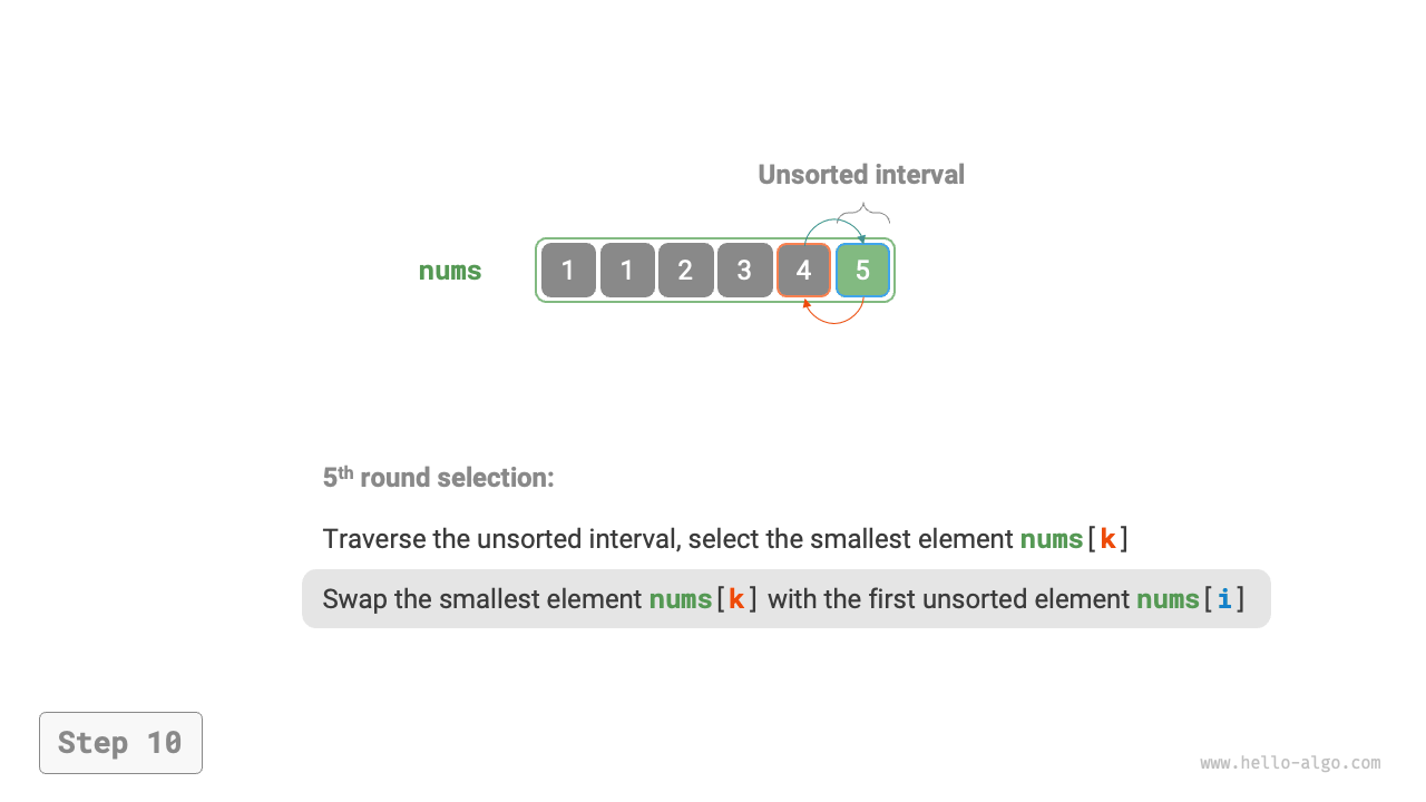 - 区間\([1, n-1]\)の最小要素を選択し、インデックス\(1\)の要素と交換します。この後、配列の最初の2つの要素がソートされます。