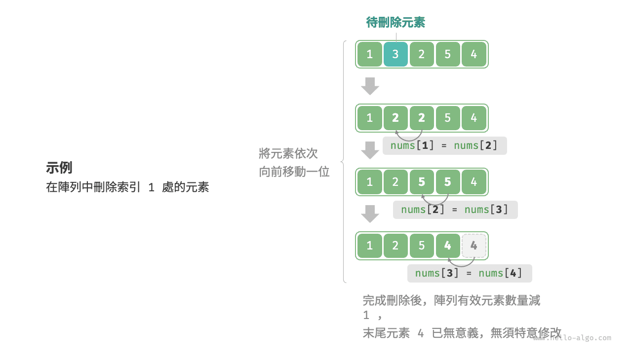 ### 刪除索引 index 處的元素 ###defremove(nums,index)# 把索引 index 之後的所有元素向前移動一位foriinindex...(nums.length-1)nums[i]=nums[i+1]endend