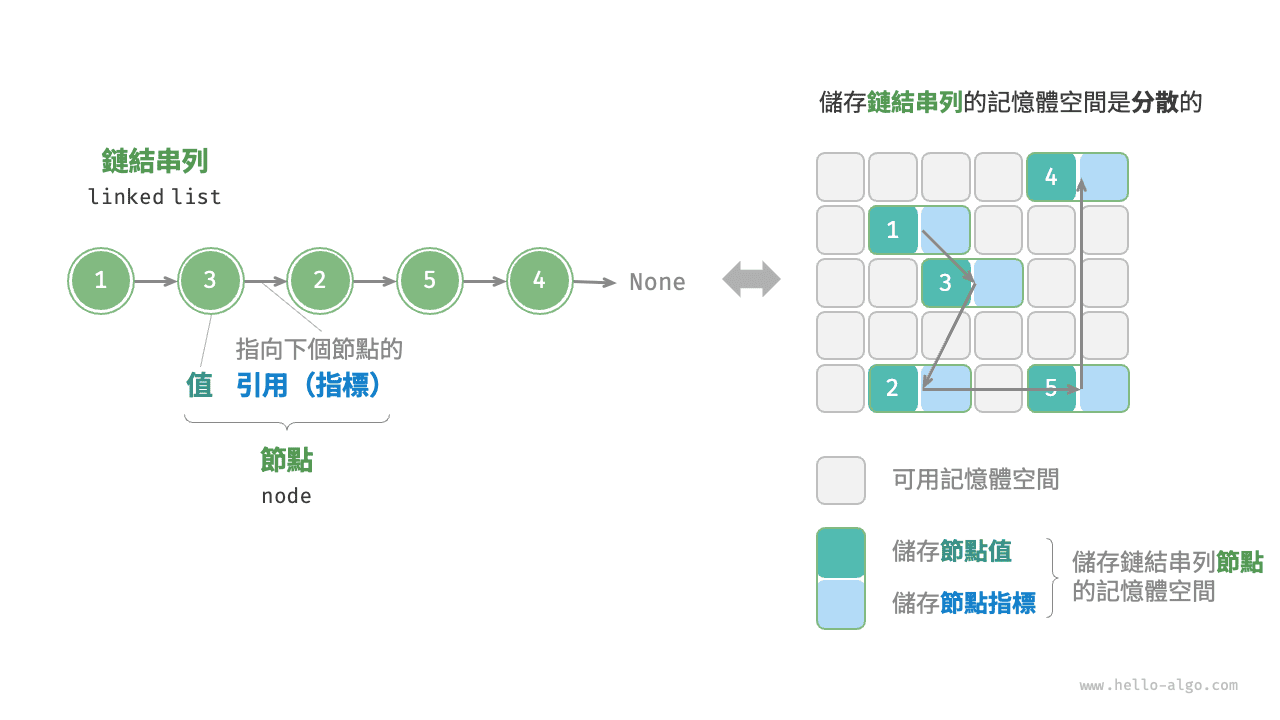 鏈結串列的設計使得各個節點可以分散儲存在記憶體各處,它們的記憶體位址無須連續。