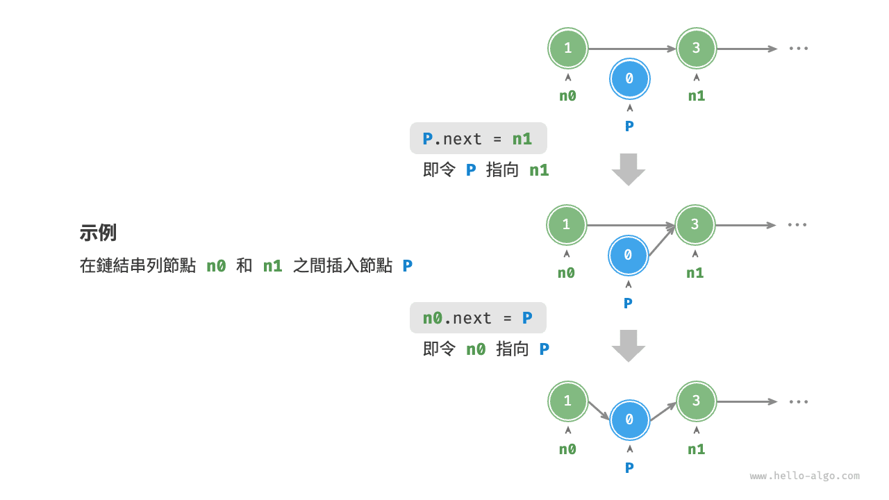 在鏈結串列中插入節點非常容易。如圖 4-6 所示,假設我們想在相鄰的兩個節點 n0 和 n1 之間插入一個新節點 P ,則只需改變兩個節點引用(指標)即可 ,時間複雜度為 \(O(1)\) 。