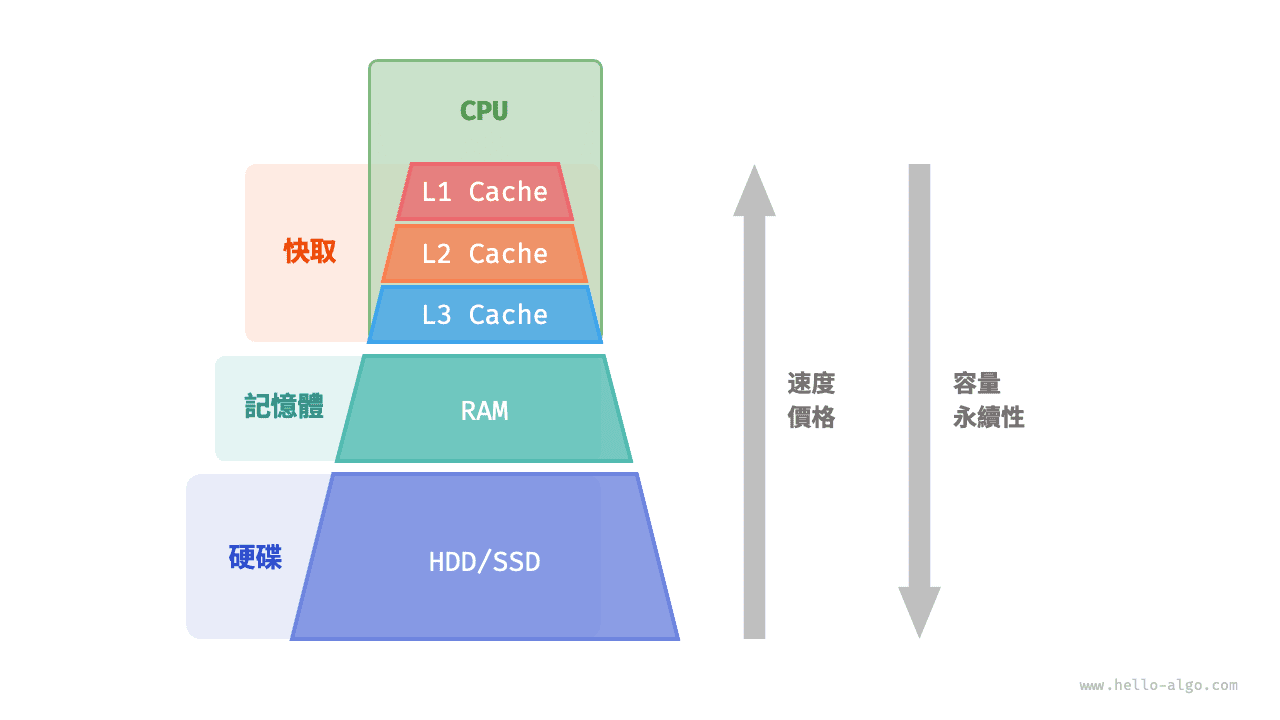 我們可以將計算機儲存系統想象為圖 4-9 所示的金字塔結構。越靠近金字塔頂端的儲存裝置的速度越快、容量越小、成本越高。這種多層級的設計並非偶然,而是計算機科學家和工程師們經過深思熟慮的結果。