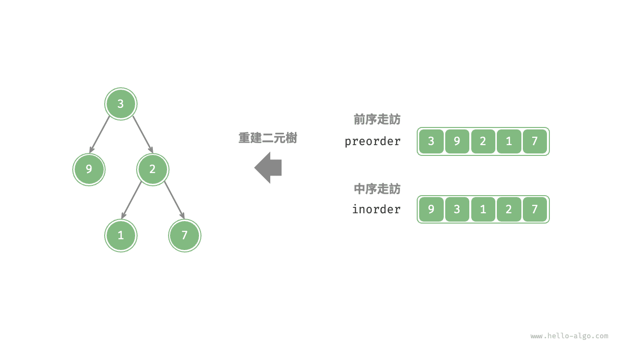 給定一棵二元樹的前序走訪 preorder 和中序走訪 inorder ,請從中構建二元樹,返回二元樹的根節點。假設二元樹中沒有值重複的節點(如圖 12-5 所示)。