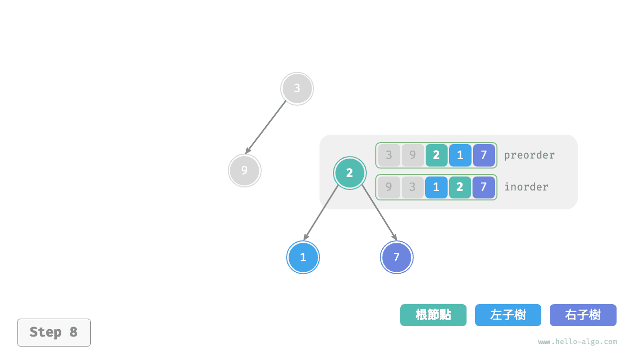 inorder的劃分結果,易得左子樹和右子樹的節點數量分別為 1 和 3 ,從而可將preorder劃分為[ 3 | 9 | 2 1 7 ]。