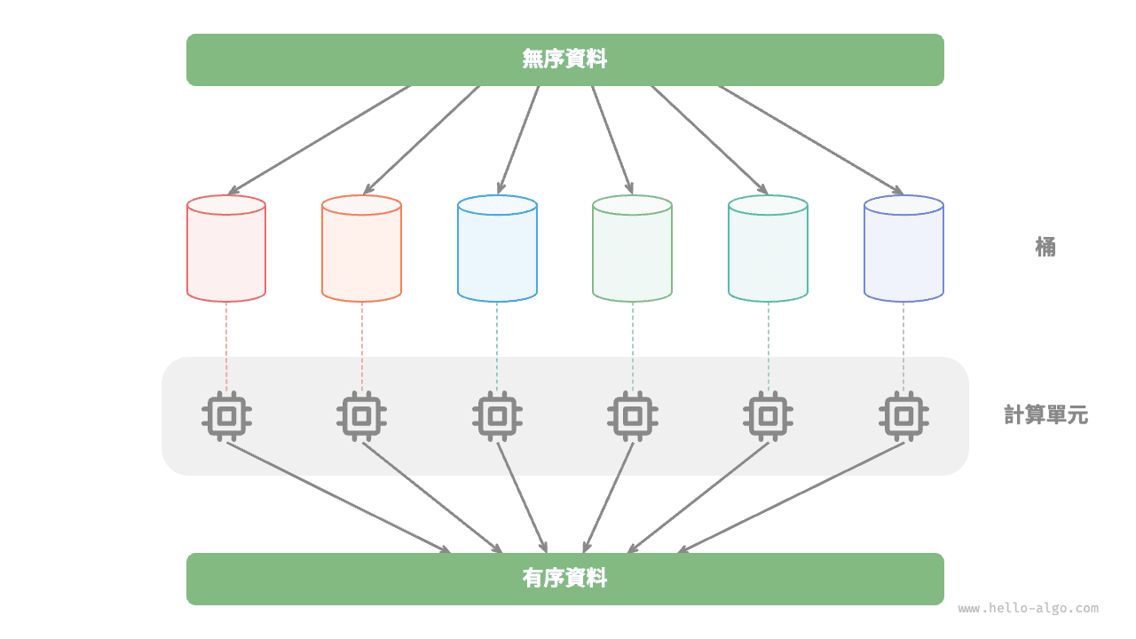 比如在圖 12-3 所示的“桶排序”中,我們將海量的資料平均分配到各個桶中,則可將所有桶的排序任務分散到各個計算單元,完成後再合併結果。